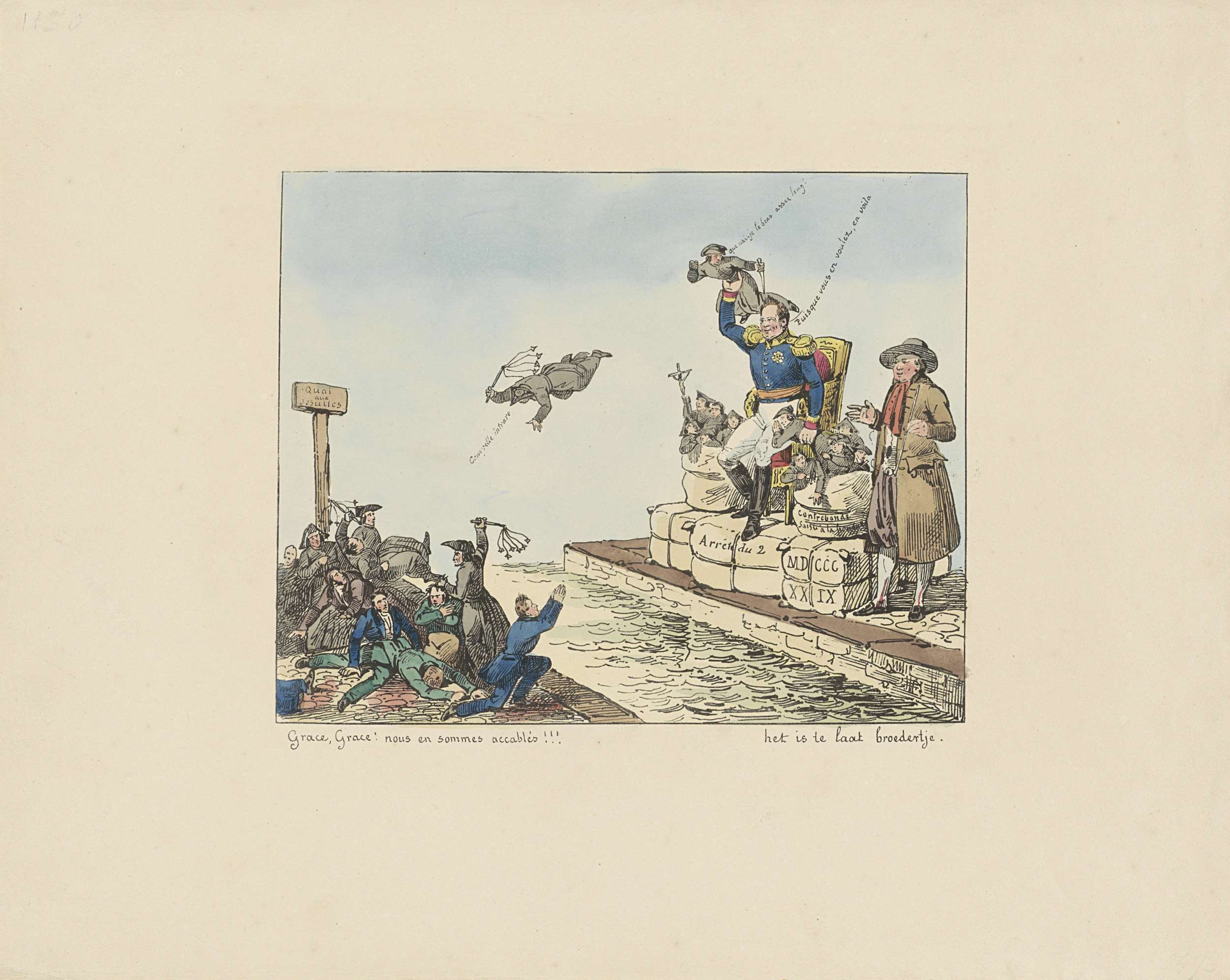 Rechts zit koning Willem I op een baal gemerkt met een besluit met de datum 2 oktober 1829. Naast hem twee zakken waaruit hij jezuïten haalt en aan de overkant van een water op de 'Quai des Jesuites' werpt. Een Hollander ziet goedkeurend toe. Spotprent op de opheffing van het Collegium Philosophicum te Leuven in ...