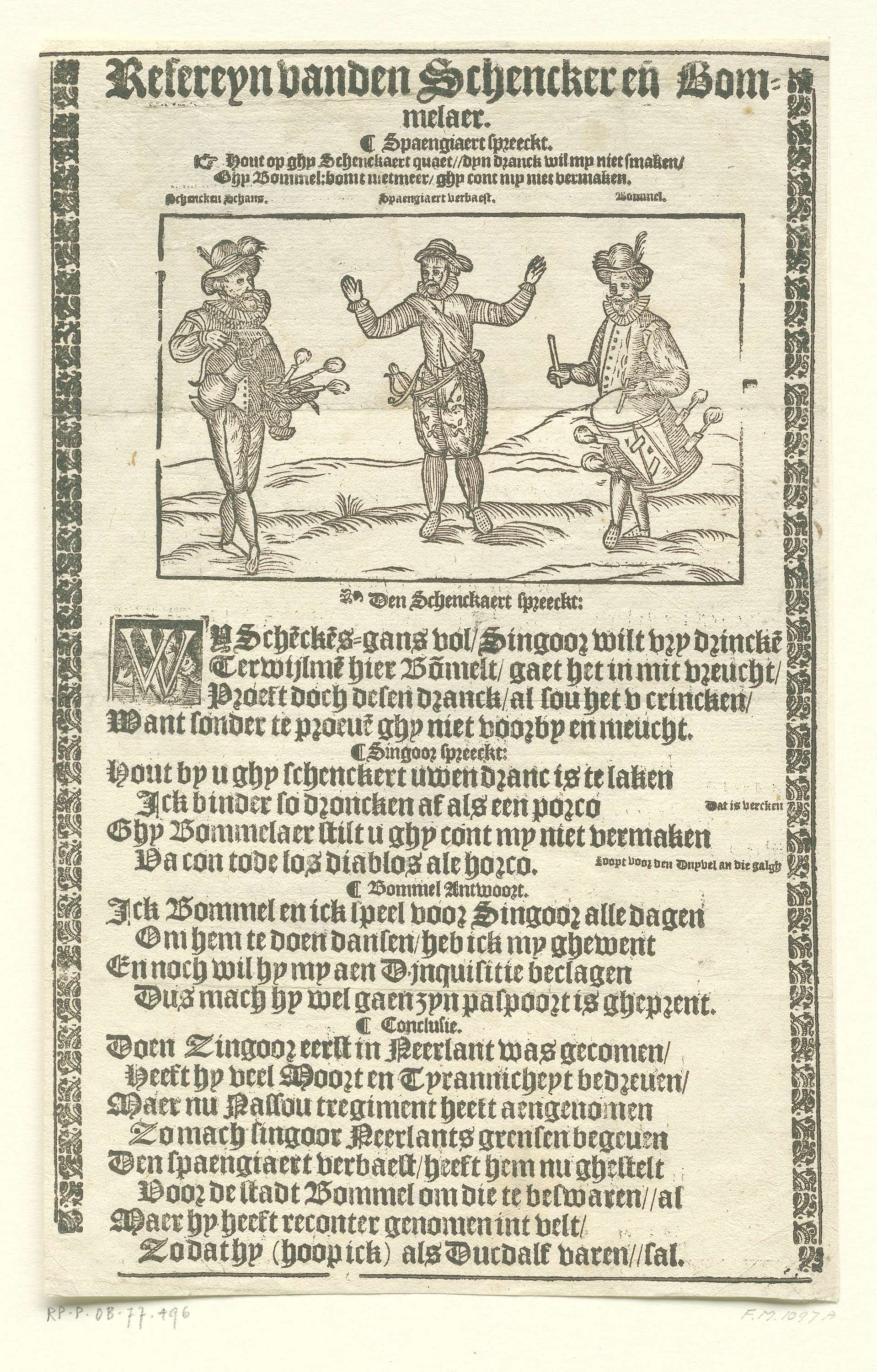 Refrein op de mislukte belegeringen door het Spaanse leger onder Mendoza van Schenckenschans en Zaltbommel, verdedigd door het Staatse leger onder Maurits van eind april tot mei 1599. Drie krijgslieden naast elkaar staand. De Staatse soldaten aangeduid als 'Schenken Schans' en 'Bommel' en de Spanjaard als 'Spaengiaert verbaest'. Onder de afbeelding drie vierregelige versjes waarin ...