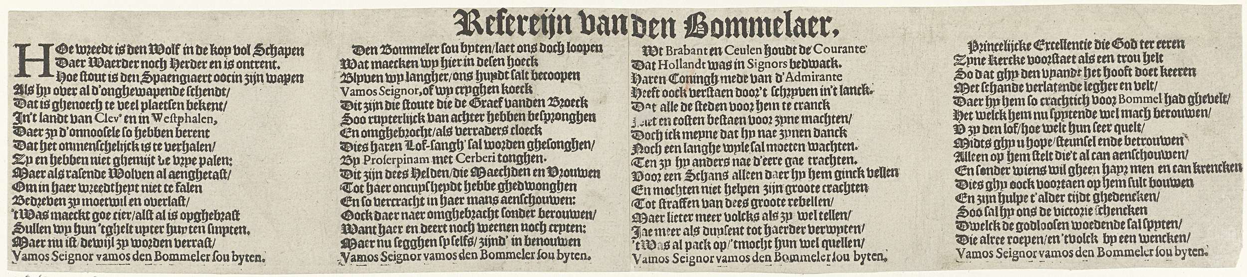Gedrukte vers over de mislukte belegeringen in de Bommelerwaard, 1599; vier verzen van elk 16 regels in het Nederlands.