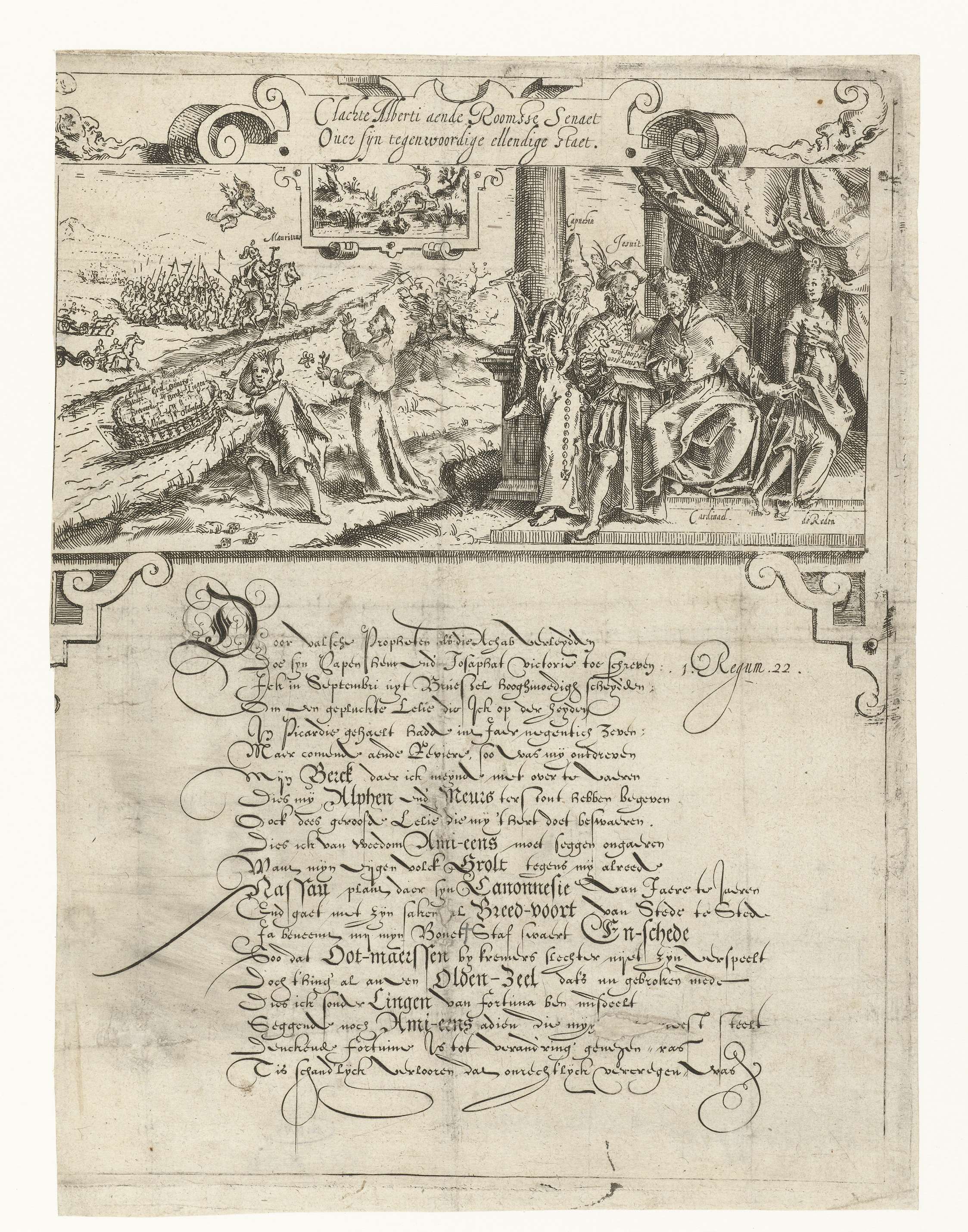 Spotprent op de verliezen van de Spanjaarden tijdens de veldtocht van Maurits in 1597. Rechts zit kardinaal Albrecht op een troon onder een baldakijn. Hij weert de Rede af en leent het oor aan een Jezuïet (met brief) die met een Capucijner monnik (met crucifix) aan zijn linkerzijde staat. Links in de rivier een schip ...