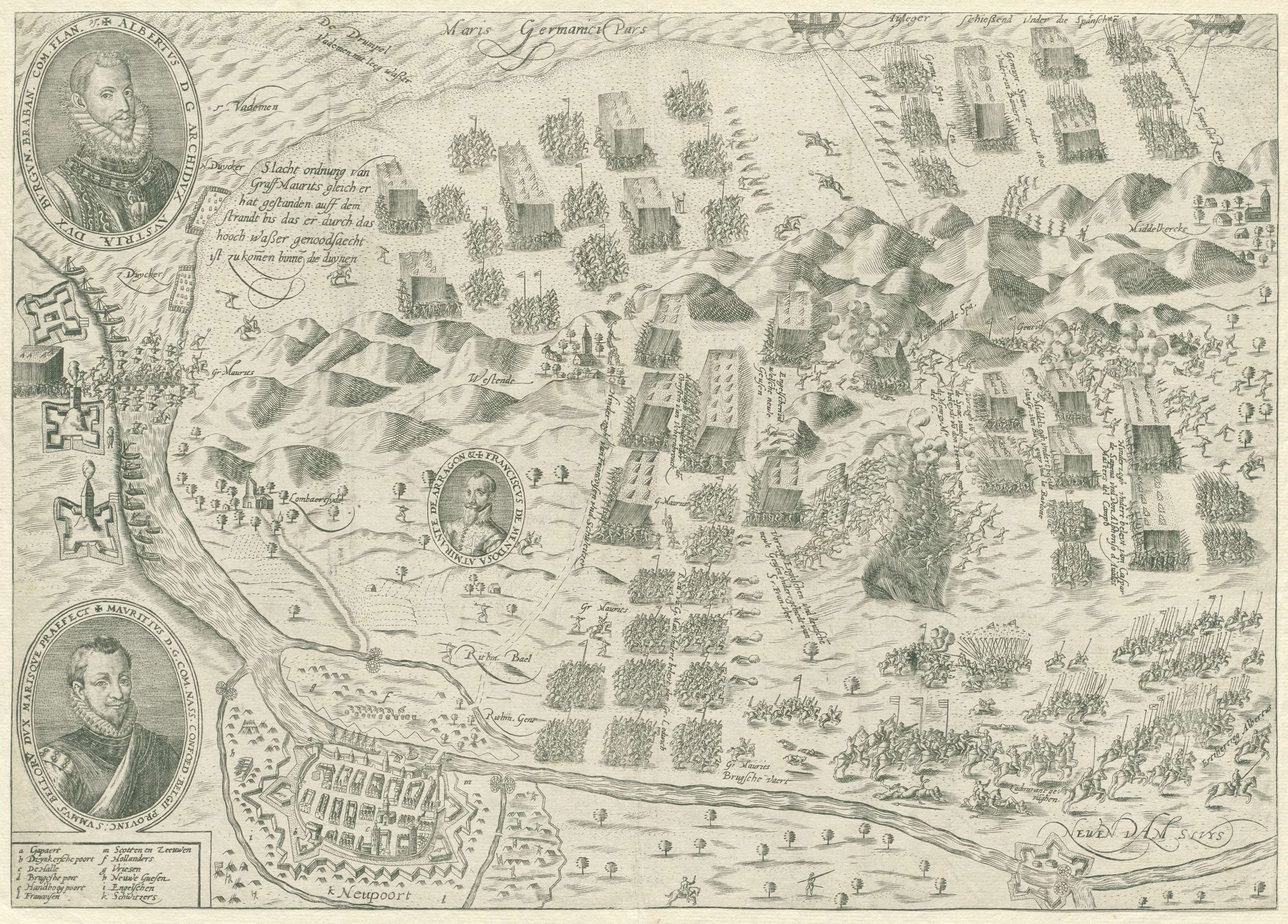 Slag bij Nieuwpoort, 2 juli 1600. Veldslag tussen de Staatse en Spaanse op het strand bij Nieuwpoort. Links ovale portretten van aartshertog Albrecht (boven), prins Maurits (onder) en kleiner: Francisco de Mendoza (midden). Linksonderaan de legenda a-m. In de voorstelling opschriften in het Duits.