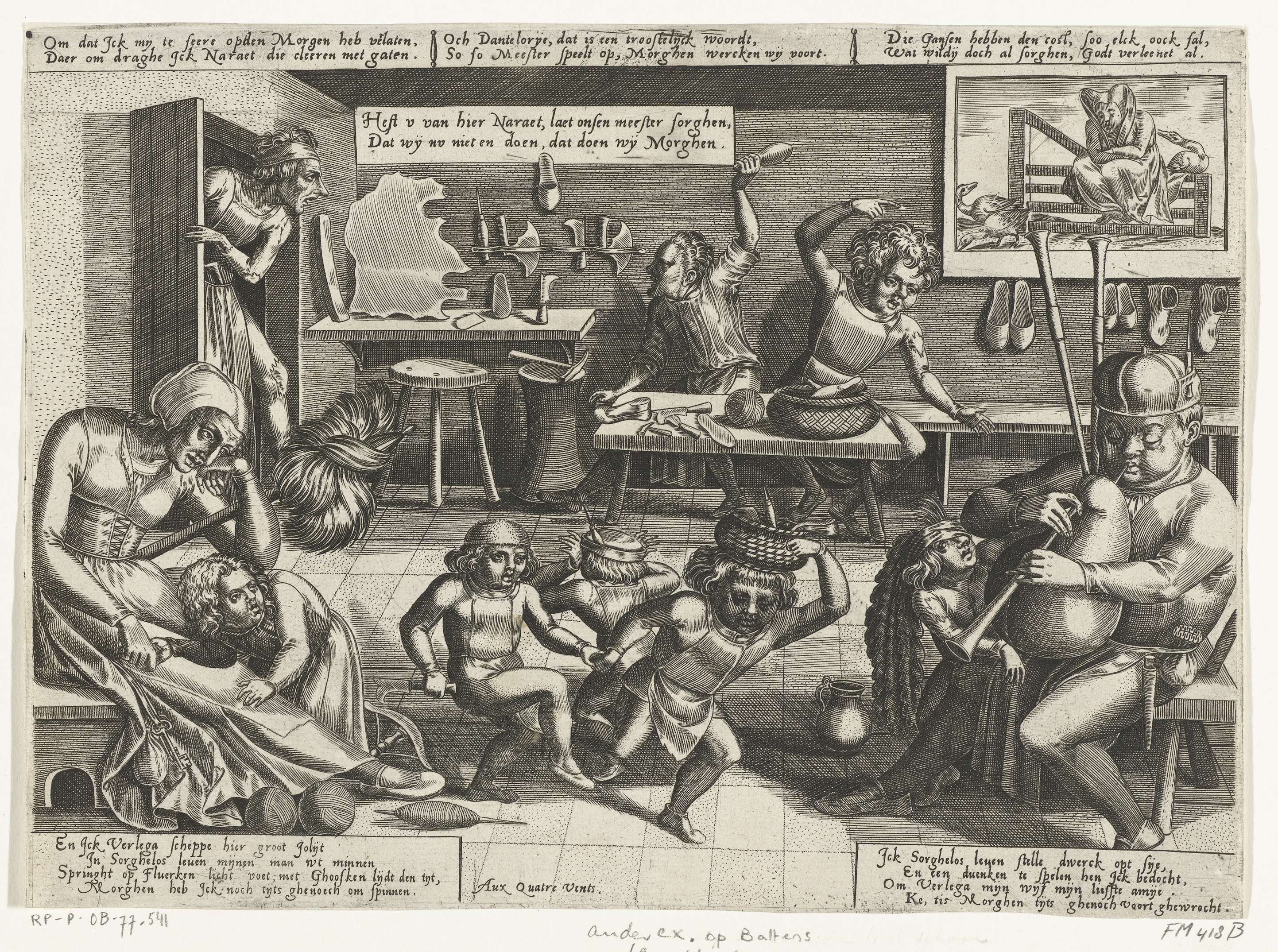 Sorgheloos leven. Zorgenloos leven. Spotprent op de luiheid. In een schoenmakerswerkplaats speelt de schoenmaker doedelzak. Tegenover hem zit zijn vrouw, rustend op haar spinrokken, een kind aan haar schoot. Andere kinderen spelen in het vertrek. Tegen de achterwand twee leerlingen die ook niet werken. Aan de muur een afbeelding van een vrouw die op hek ...
