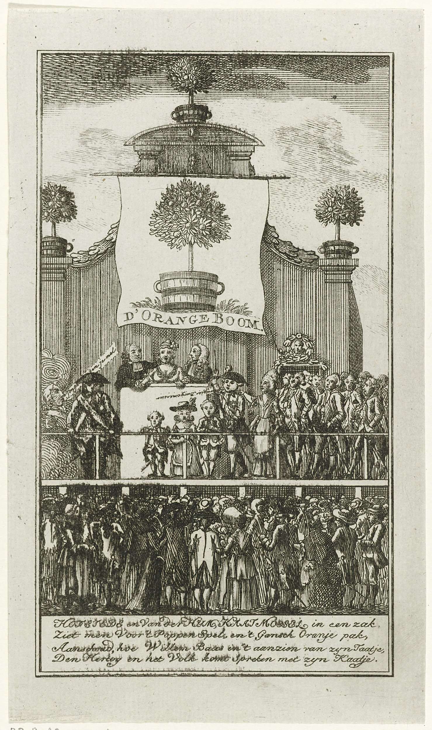 Spotprent op Petrus Hofstede, Kaat Mossel en prins Willem V, 1783. Voor een kermistent hangt een banier waarop de oranjeboom is afgebeeld. Op een verhoging staan Hofstede, de Rotterdamse burgemeester Van der Heim en Kaat Mossel, daarvoor de Prins met zijn drie kinderen, diens gemalin en de hertog van Brunswijk. Op de voorgrond het verzamelde ...