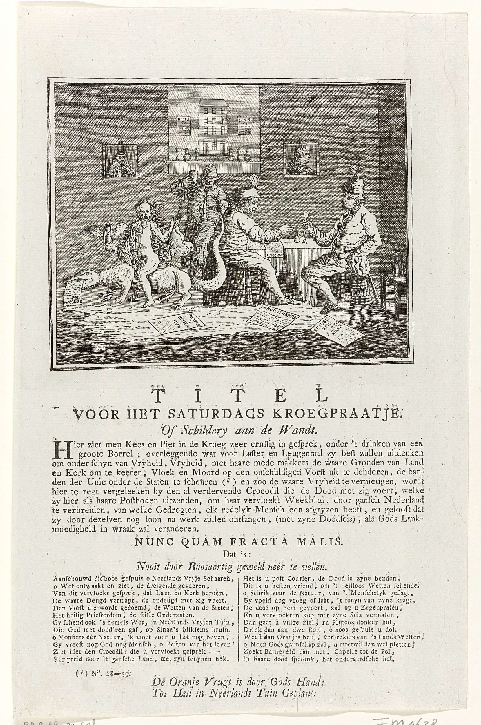 Spotprent op het Rotterdams patriots blaadje Saturdags Kroegpraatje dat op 4 maart 1786 voor het eerst verscheen. In een herberg zitten twee patriotische werklieden onder het drinken van een borrel te praten. Links rijdt de Dood op een krokodil. Op degrond liggen patriotse bladen: 'het Kroegpraatje', 'Post voor de Nederrijn' en 'Republikein aan de Maas'. ...