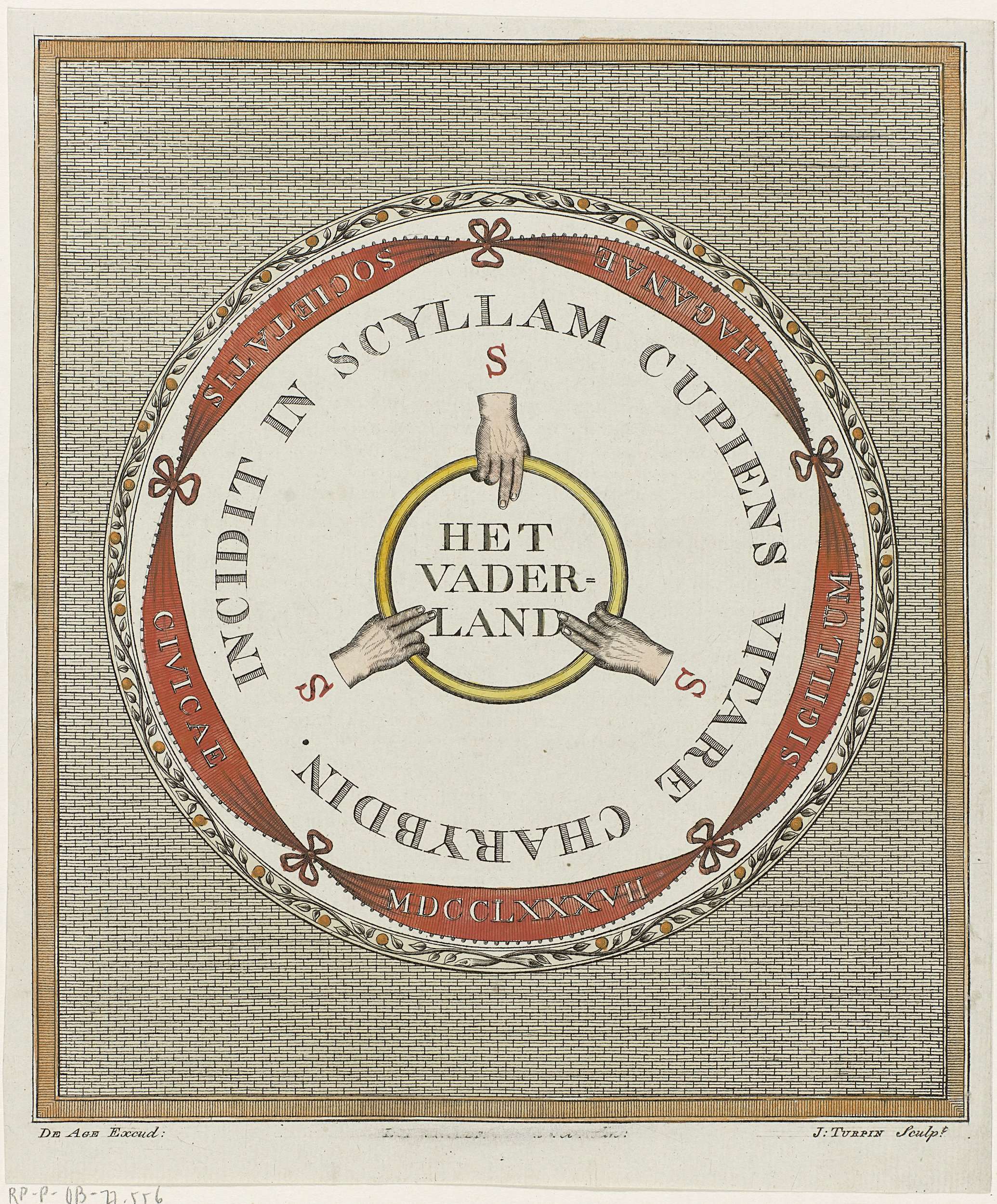 Zegel van het oranjegezinde genootschap Oprechte Vaderlandsche Sociëteit van Den Haag, opgericht op 10 april 1787. In het midden drie handen die een eed afleggen en een ring vasthouden. Hieromheen de motto van het genootschap: Incidit in Scyllam Cupiens Vitare Charybdin.