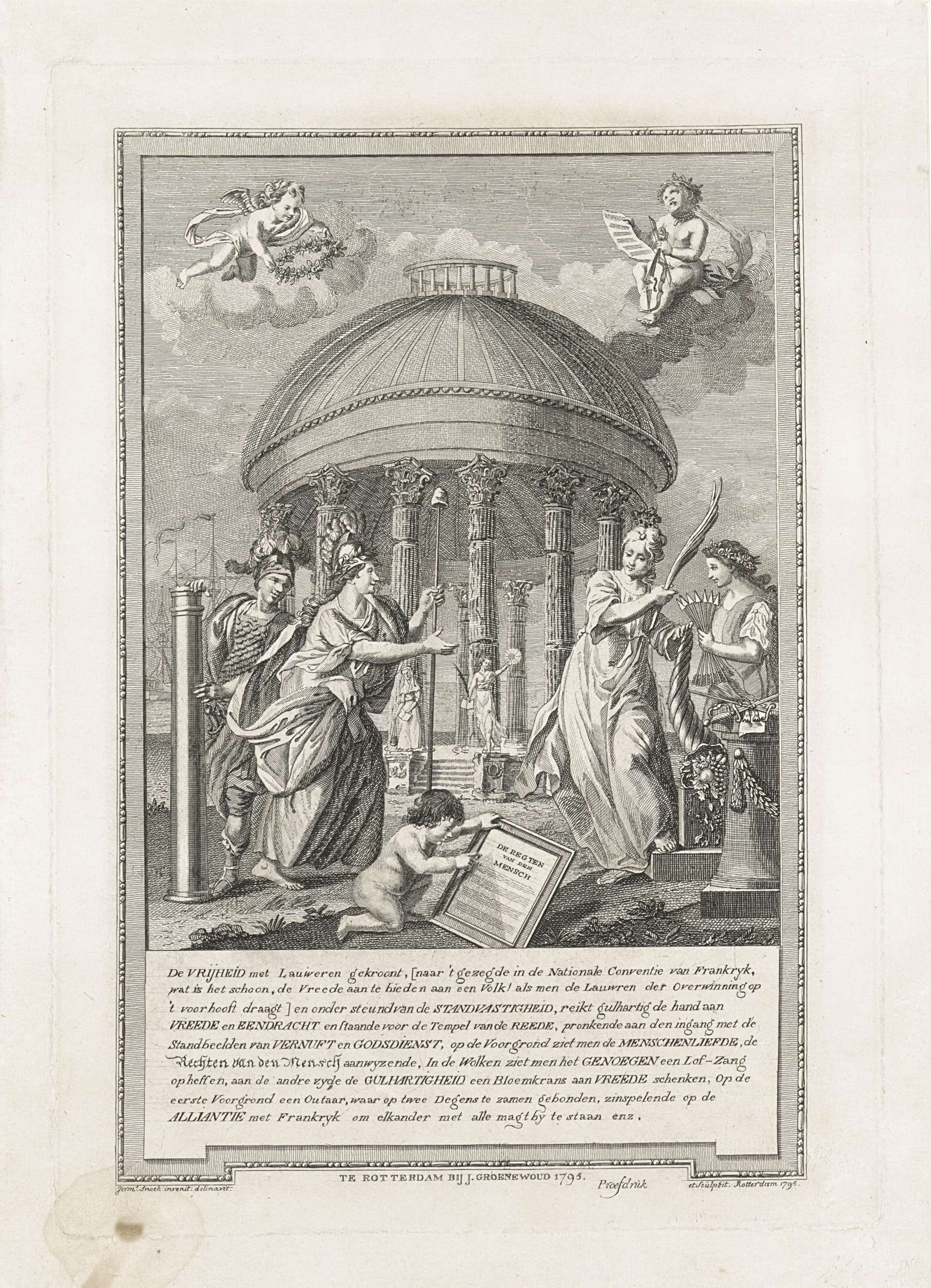 De Vrijheid , vergezeld van Standvastigheid, reikt de hand aan Vrede en Eendracht. Op de achtergrond de Tempel der Rede. Op de voorgrond de Mensenliefde, wijzend naar een tablet waarop 'de Regten van den Mensch'. In de lucht twee engeltjes. Met onderschrift. Afbeelding en tekst in een kaderrand. Proefdruk.