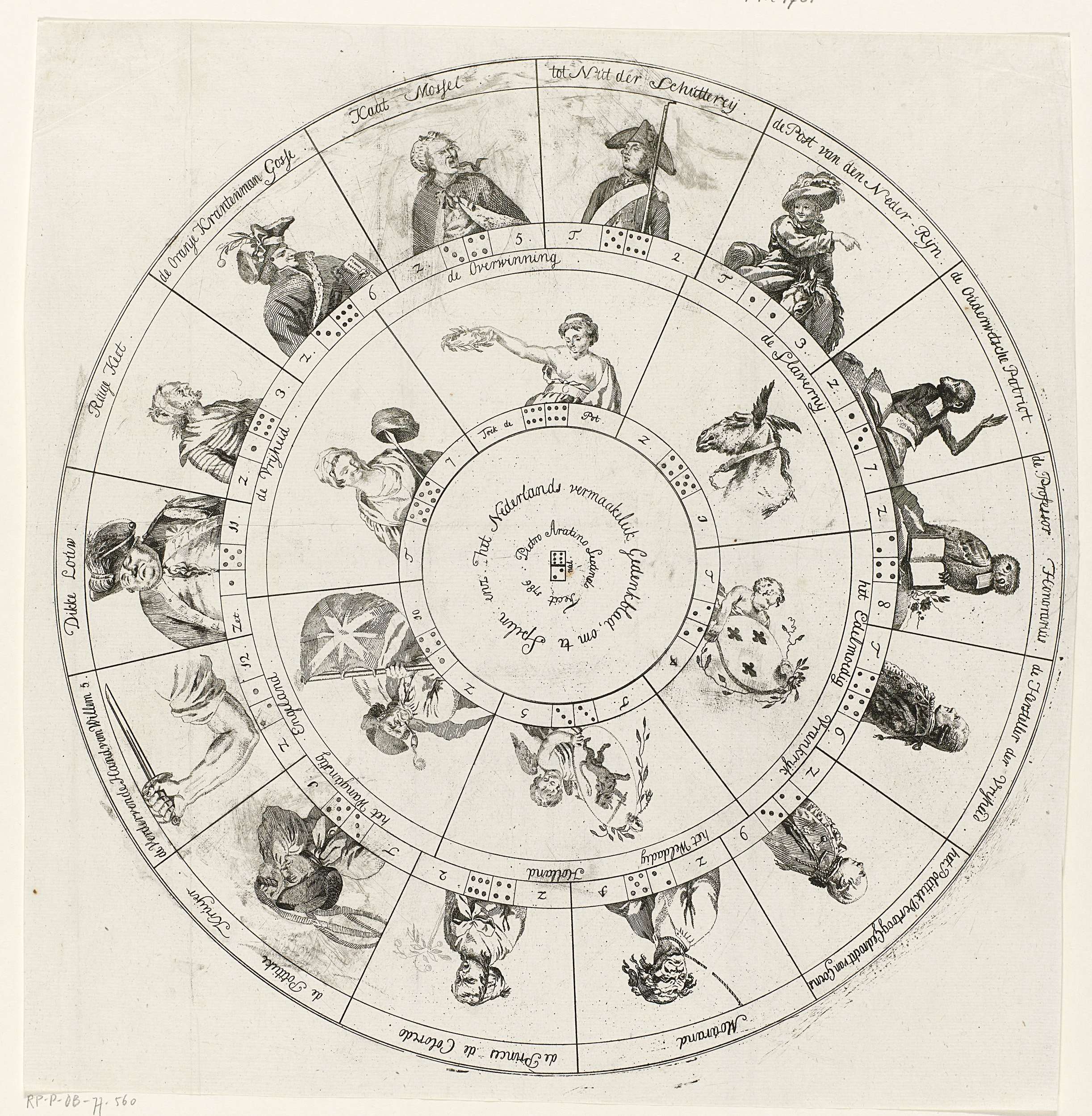 Patriots gezelschapsspel om met dobbelstenen te spelen, door Pietro Aratino Secundo. Rond bordspel met in elk vakje een hoofdfiguur, karikatuur of zinnebeeld uit de tegenwoordige Patriotse twisten. Afgebeelde personen o.a.: Kaat Mossel, Van Goens, Mourand, de hertog van Brunswijk en de Verdervende hand van Willem V.