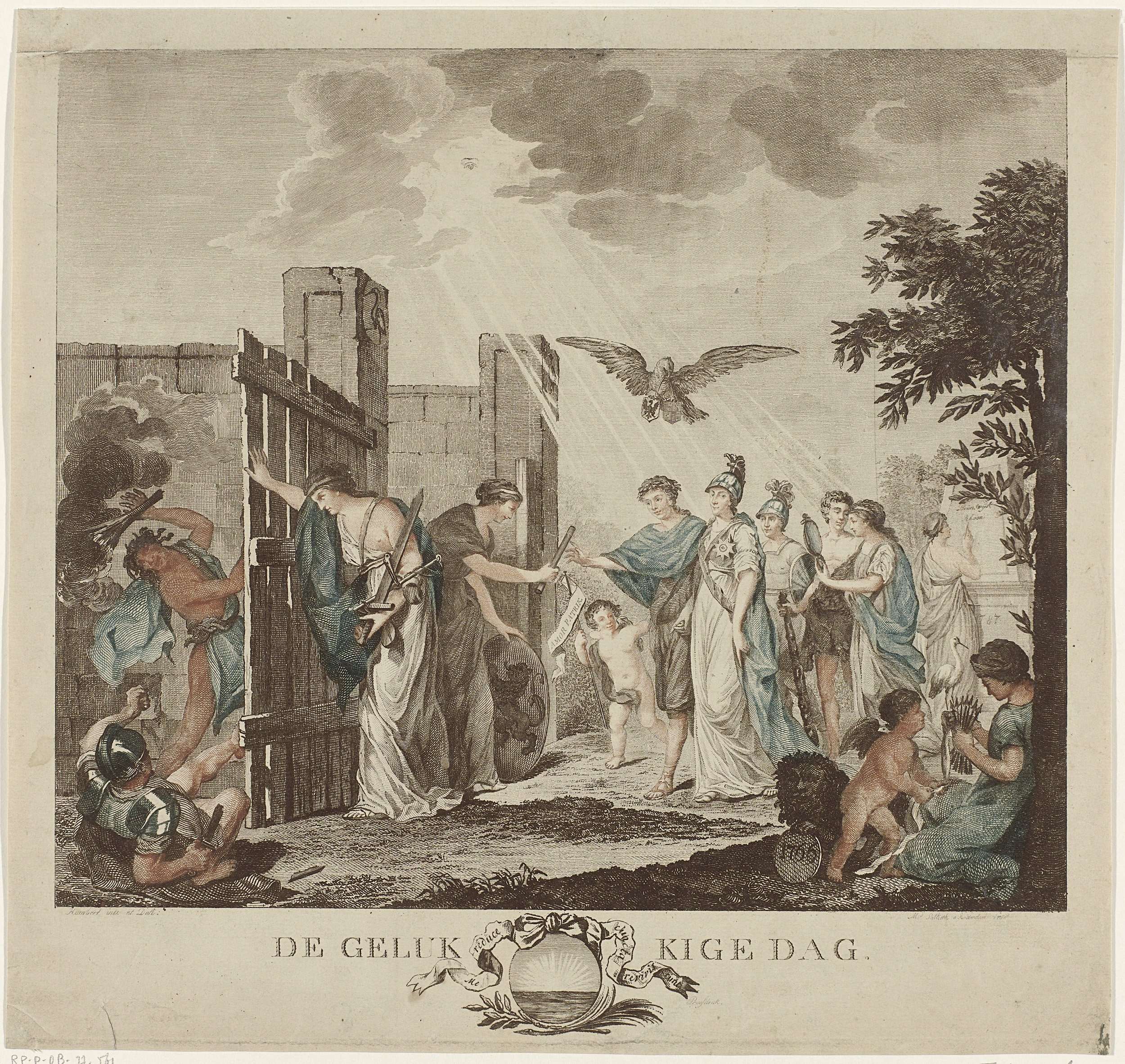 Allegorische voorstelling op het herstel van de stadhouder Willem V en zijn inhaling in Den Haag op 20 september 1787. Gerechtigheid opent de poort voor een jonge vorst (prins Willem V), zodat de weg naar Den Haag voor hem vrij is. Wangunst en Gewapende Woede proberen tevergeefs de deur tegen te houden. De Provincie Holland ...