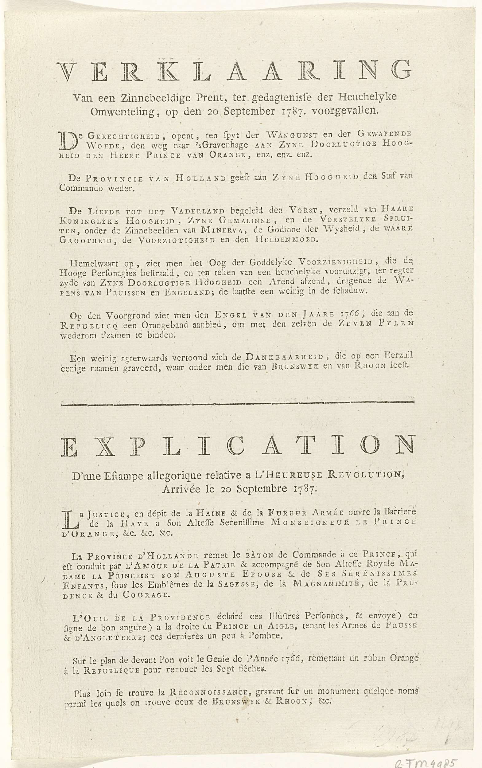 Tekstblad met de verklaring behorend bij de prent met de allegorische voorstelling op het herstel van de stadhouder Willem V en inhaling in Den Haag op 20 september 1787. Tekst in Nederlands en Frans.