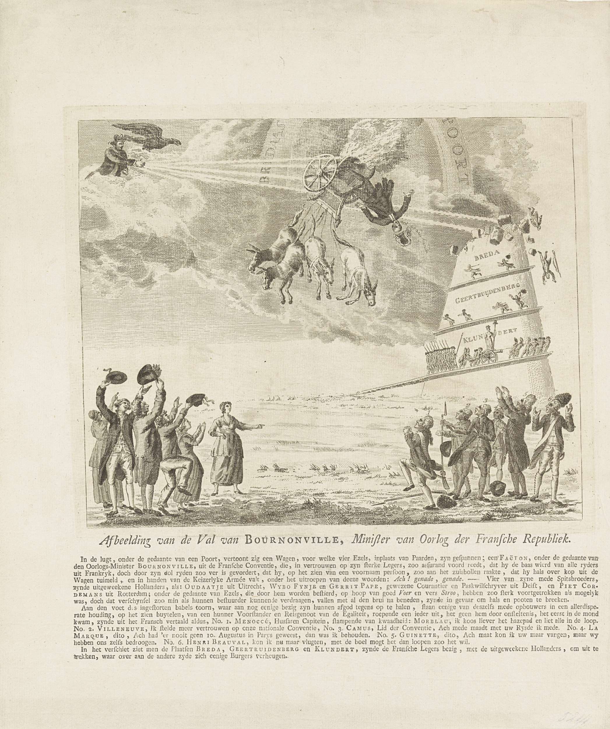 Spotprent op de gevangenneming van Pierre Riel de Beurnonville, de Franse minister van Oorlog, te St. Amant dankzij het verraad van de overgelopen Dumouriez. De val van de Beurnonville afgebeeld als de val van Phaëthon. De zonnewagen getrokken door vier ezels die patriotten (Oudaatje, Wybo Fijnje, Gerrit Pape en Pieter Cordemans) voorstellen. Rechts een afbrokkelende ...