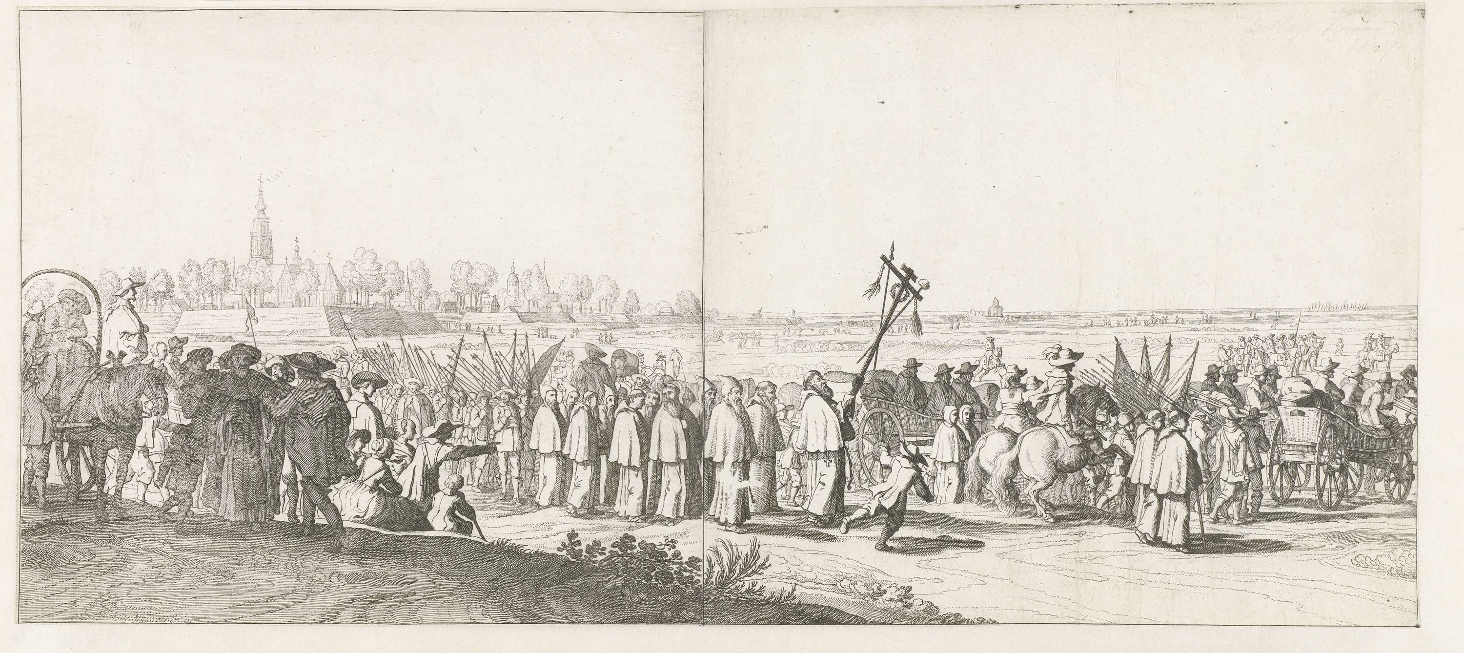 De uittocht van het Spaanse garnizoen uit Breda na de verovering door het Staatse leger onder Frederik Hendrick, 10 oktober 1637. Eerste en tweede blad uit een compleet ongemonteerd ensemble van vier bladen. De stoet trekt voorbij aan de toeschouwers, op de achtergrond het profiel van de stad. In de stoet monniken, soldaten en enkele ...