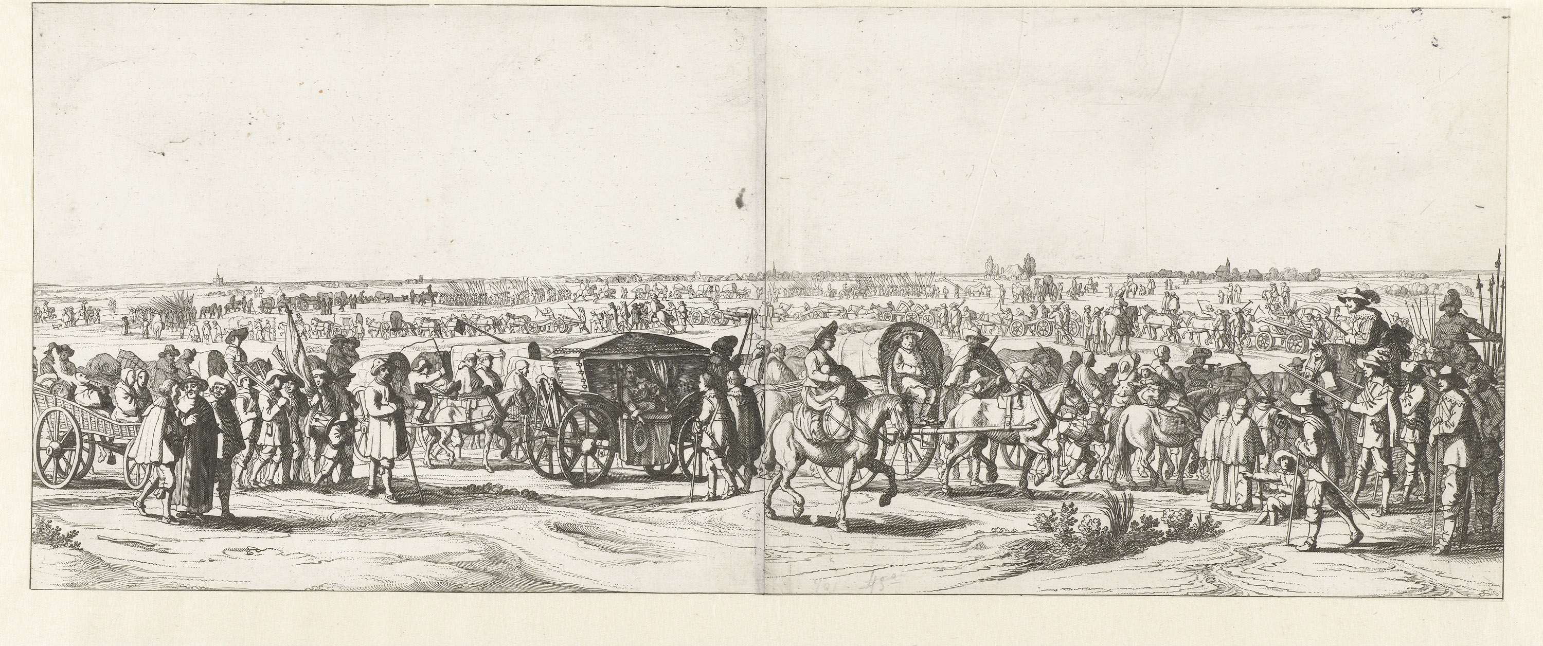 De uittocht van het Spaanse garnizoen uit Breda na de verovering door het Staatse leger onder Frederik Hendrick, 10 oktober 1637. Derde en vierde blad uit een compleet ongemonteerd ensemble van vier bladen. De stoet trekt voorbij aan een groep militairen rechts. In de stoet soldaten, monniken en de gouverneur van Breda in een wagen. ...