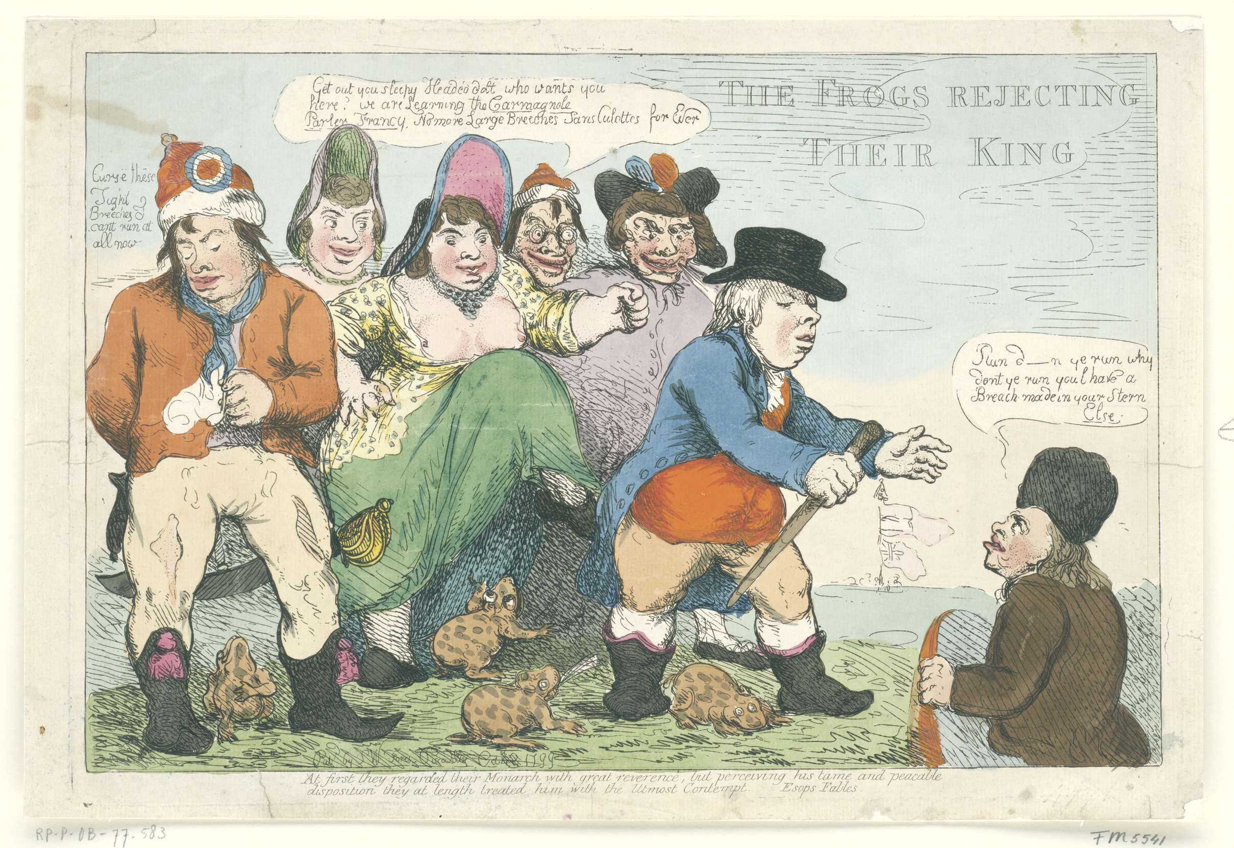 Engelse spotprent op het mislukken van de Brits-Russische expeditie in Noord-Holland om het huis van Oranje in ere te herstellen. De blinde prins Willem V wordt door een Hollands viswijf met ontblote borsten en andere figuren bespot en met een trap op zijn achterste weggejaagd. Rechts een Engelse bootsman die prins weer ophaalt. Op de ...