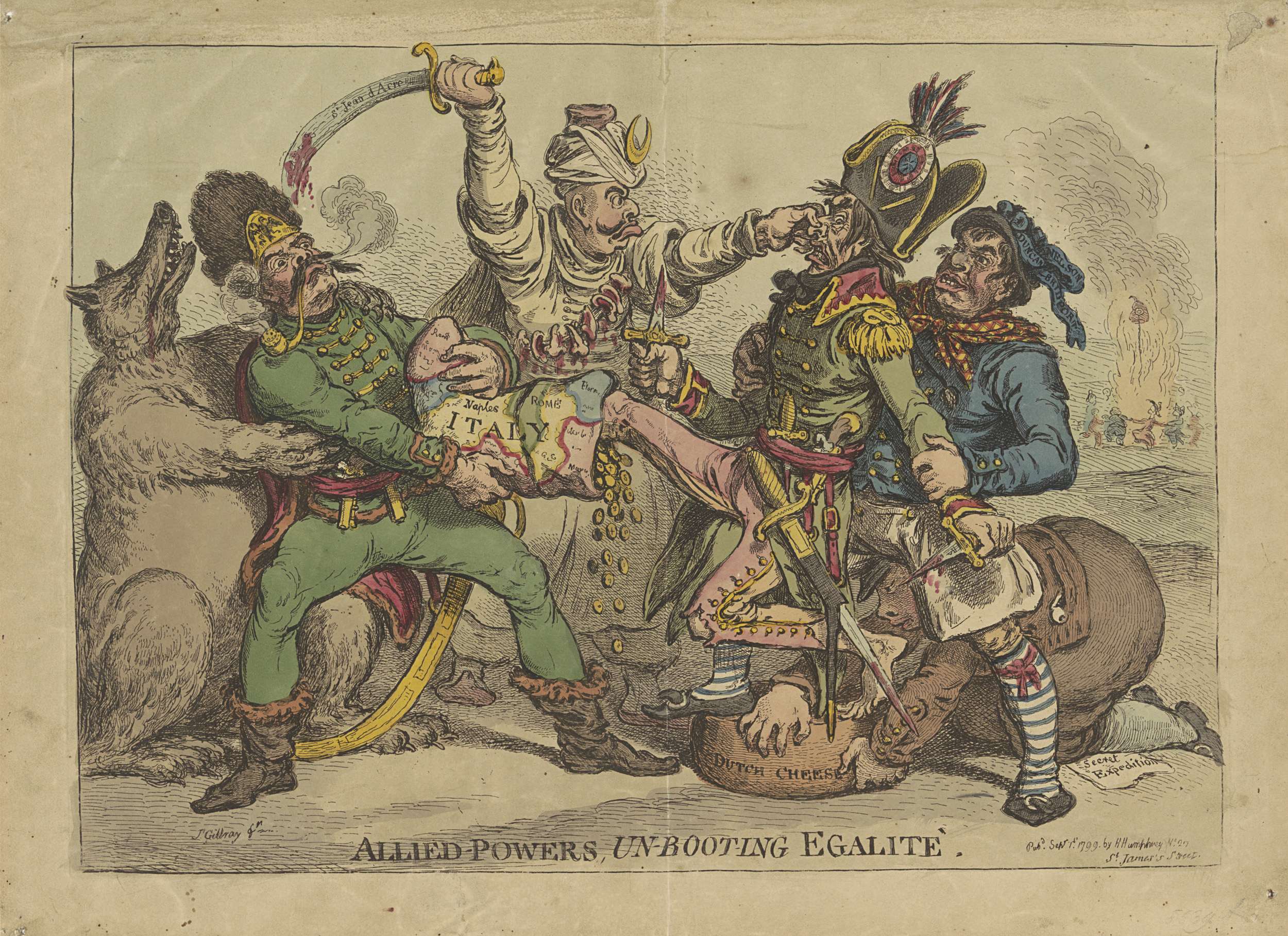 Een karikatuur van Napoleon Bonaparte wordt door de vier geallieerde partijen (Oostenrijk, Ottomaanse rijk, Groot-Brittannië en Nederland) aangevallen. Napoleon wordt door een Britse matroos vastgehouden, de Oostenrijker en de Russische beer proberen samen de Italiaanse laars van zijn voet te trekken, de Turk wil hem zijn neus afsnijden en deze toevoegen aan zijn verzameling afgesneden ...