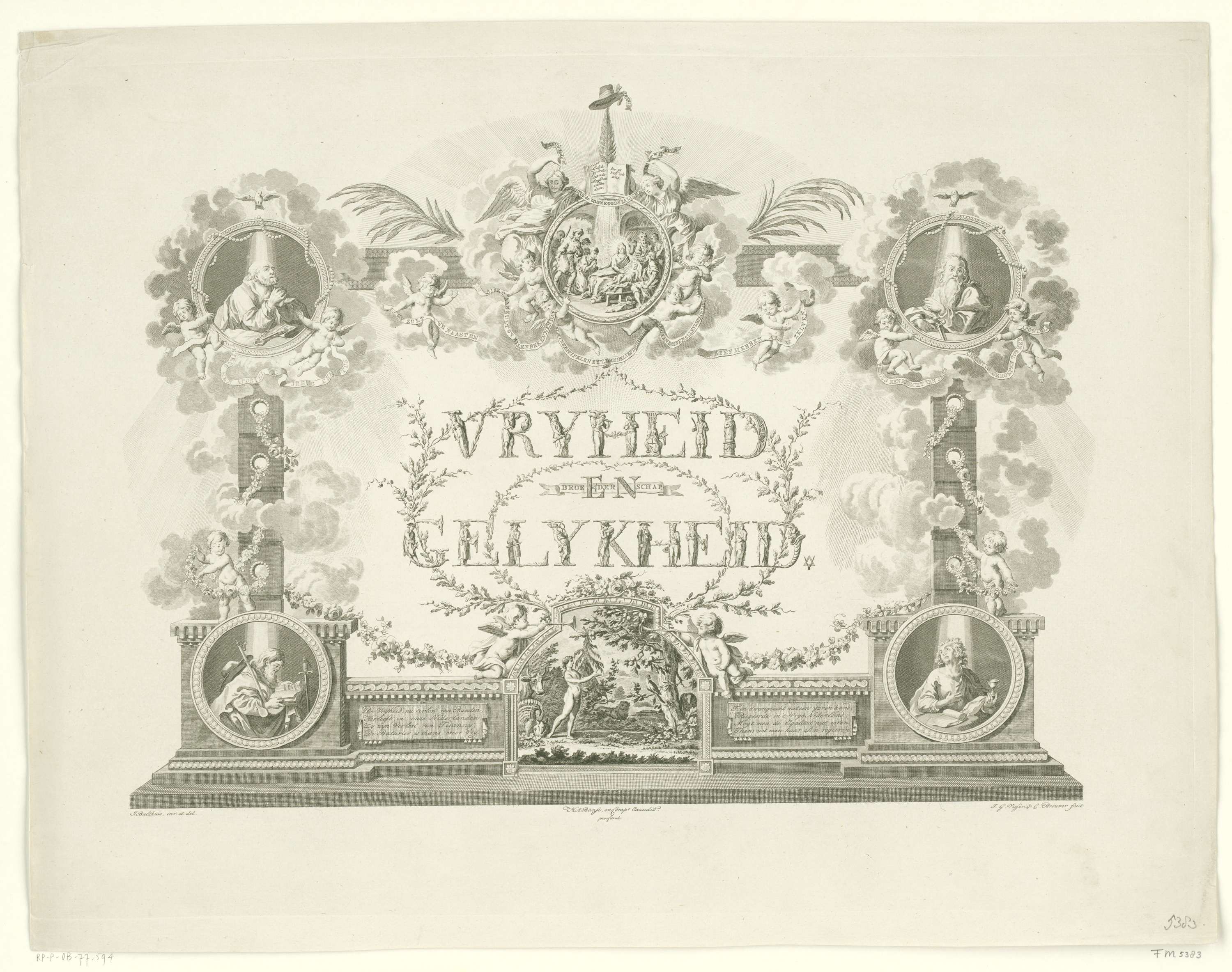 Christelijke allegorie op de Vrijheid en Gelijkheid. Opschrift in calligrafische letters, gevormd door staande mannen en vrouwen, omgeven door zes medaillons met twee bijbelse voorstellingen (Adam in het paradijs, de geboorte van Christus) en de vier Evangelisten. Onderaan twee plaquettes met vierregelige verzen. Bij het blad hoort een verklaring.