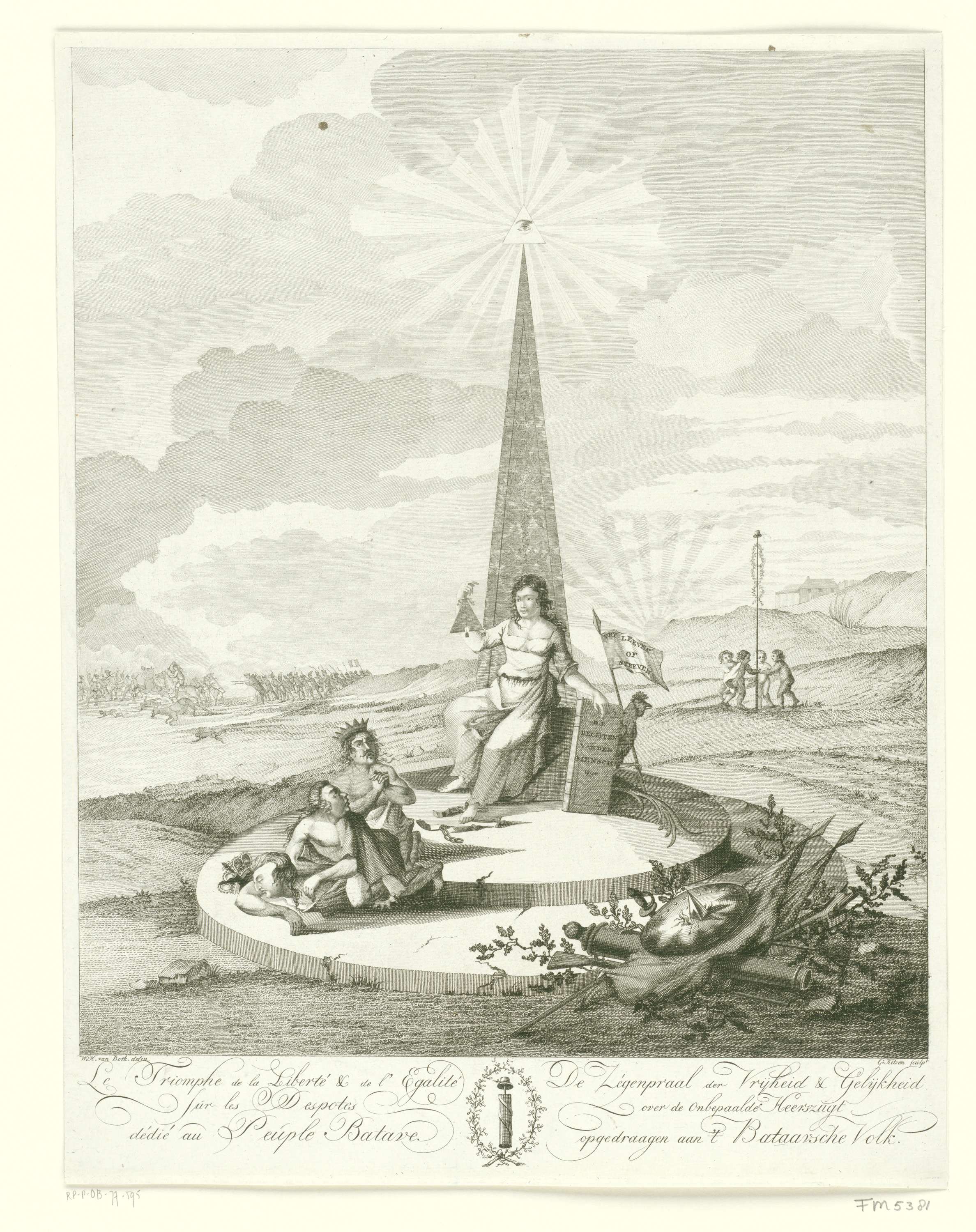 Allegorie met triomf van Vrijheid en Gelijkheid over de Heerszucht, 1795, De Gelijkheid zit op een estrade voor een obelisk (bekroond door het Alziende Oog), haar hand rustend op het boek met de Rechten van de Mens. Op de voorgrond stadhouder Willem V, een smekende koning en het afgehouwen hoofd van Lodewijk XVI. Linksachter verjaagt ...