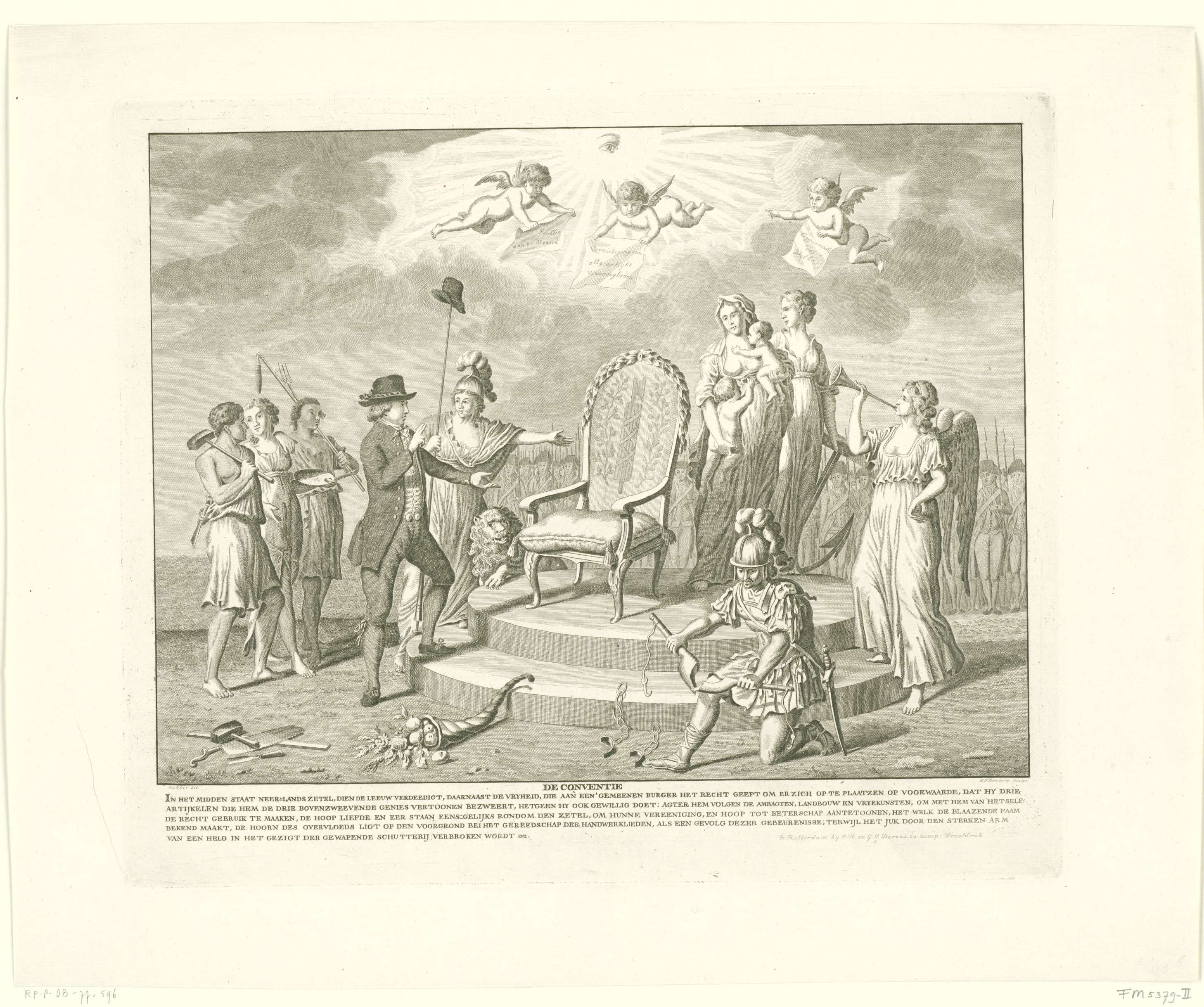 Allegorie op de Conventie, 1795. De burger bestijgt op aanwijzing van de Vrijheid het lege zetel van de macht als hij zweert op drie artikelen die door engeltjes in de lucht worden opgehouden: 'Rechten van de Mensch', 'Vernietiging van alle erflijke Waardigheden' en 'Oppermacht des Volks'. Op de voorgrond verbreekt een krijgsman een juk, op ...
