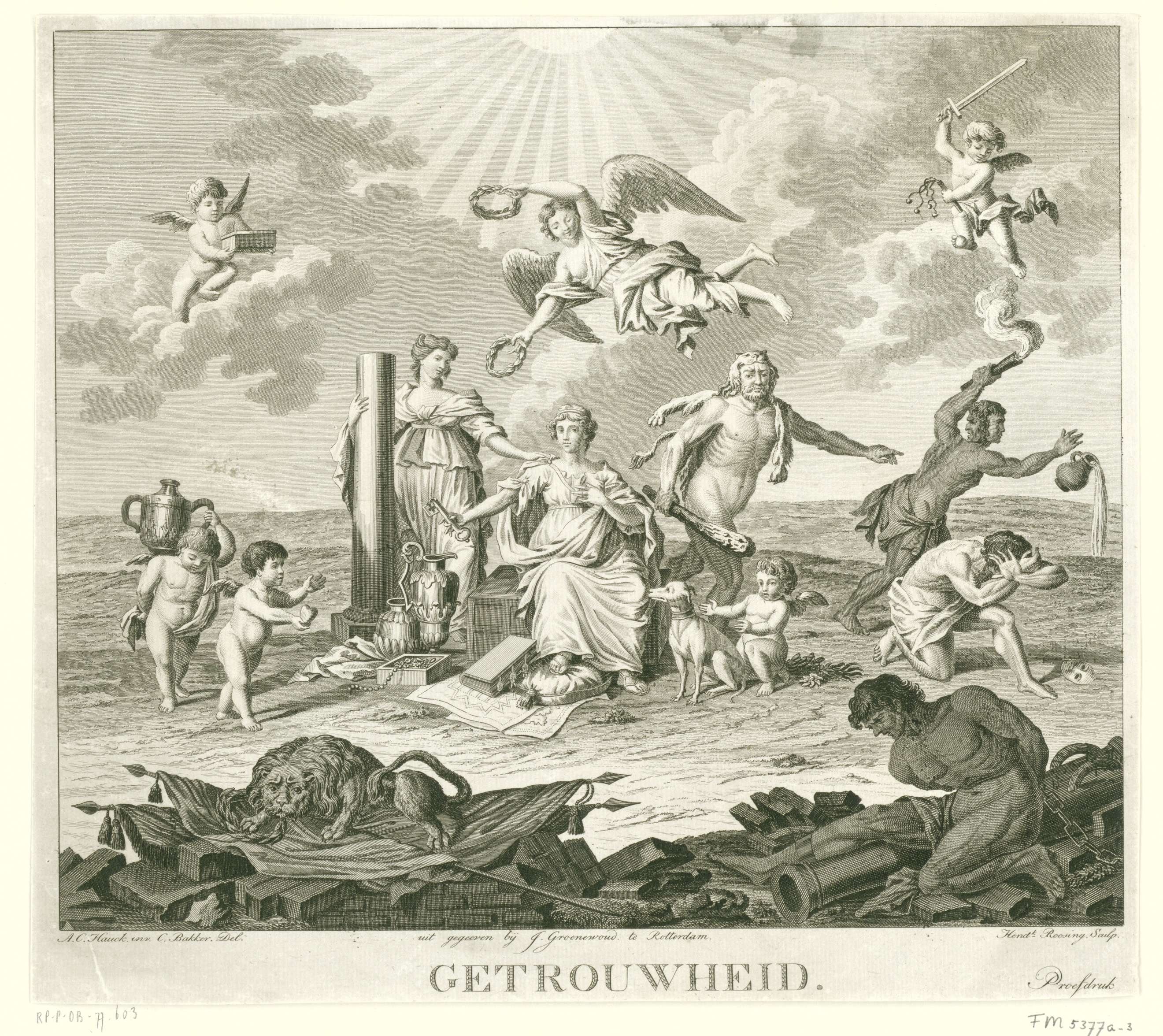 Allegorie op de Getrouwheid, 1795. Getrouwheid zetelt op een kist, sleutel in haar hand, onder voetkussen plattegronden voor vestingwerken, naast haar een hond. Links van haar Standvastigheid of Kracht, rechts verjaagt Hercules Janus (Dubbelhartigheid met vuur en water) en Bedrog. Twee engeltjes komen een hart en een kruik aanbieden. Op de voorgrond de Nederlandse leeuw ...
