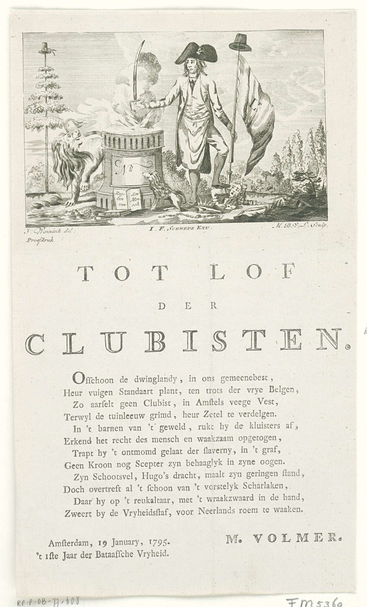 Lidmaatschapsbewijs van de Amsterdamse Clubisten, 19 januari 1795. Een Bataaf met steek en cocarde op, houdt, net als de klassieke held Mucius Scaevola, zijn rechterhand met sabel in het vuur op een altaar. In zijn andere hand houdt hij een banier met oningevuld Lr. Op het altaar het oningevulde No., ter invulling van de club ...