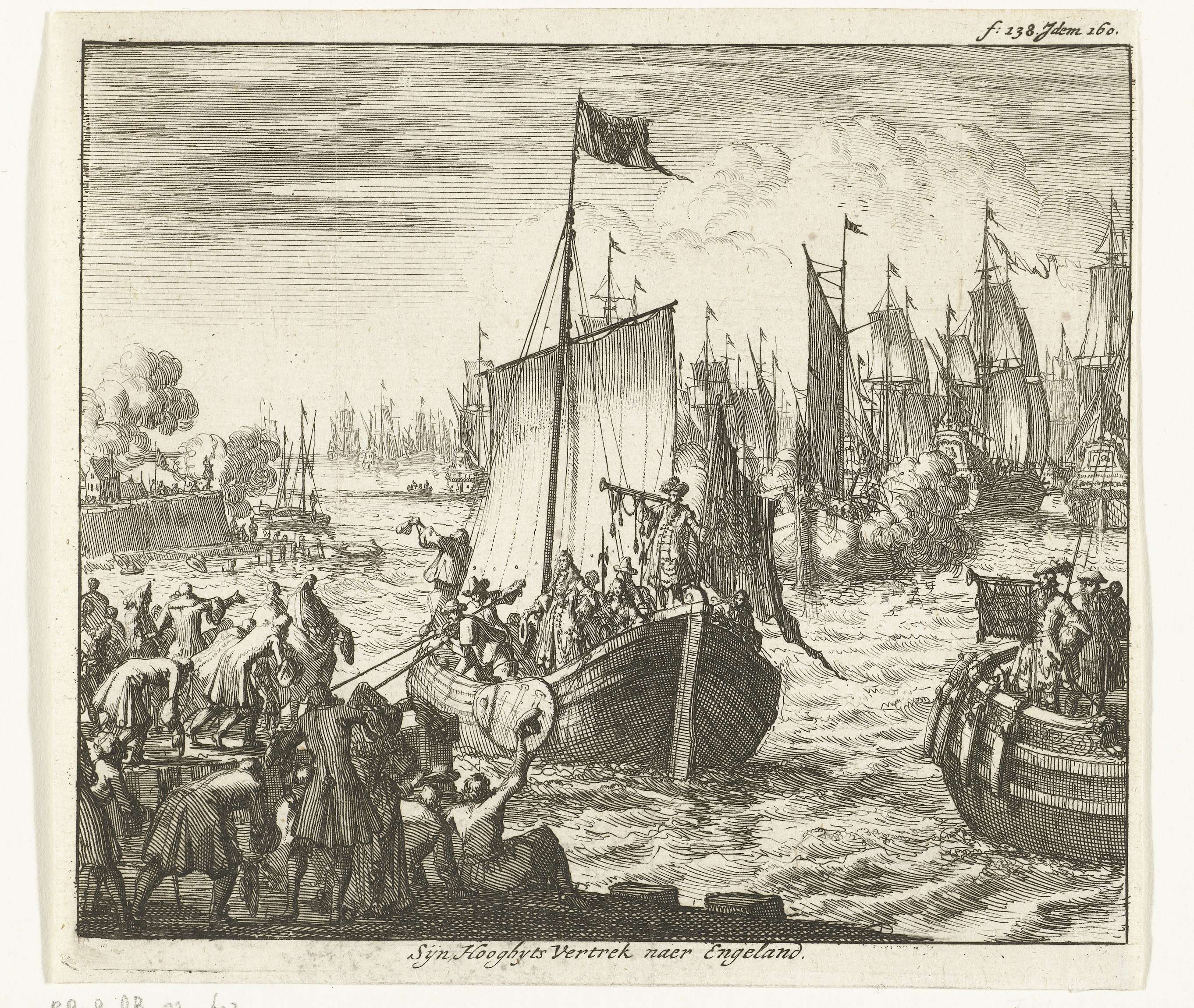 Prins Willem III vertrekt met de vloot vanuit Hellevoetsluis naar Engeland, 11 november 1688. De prins neemt op de pier afscheid. Gemerkt rechtsboven: f: 138 Idem 160.