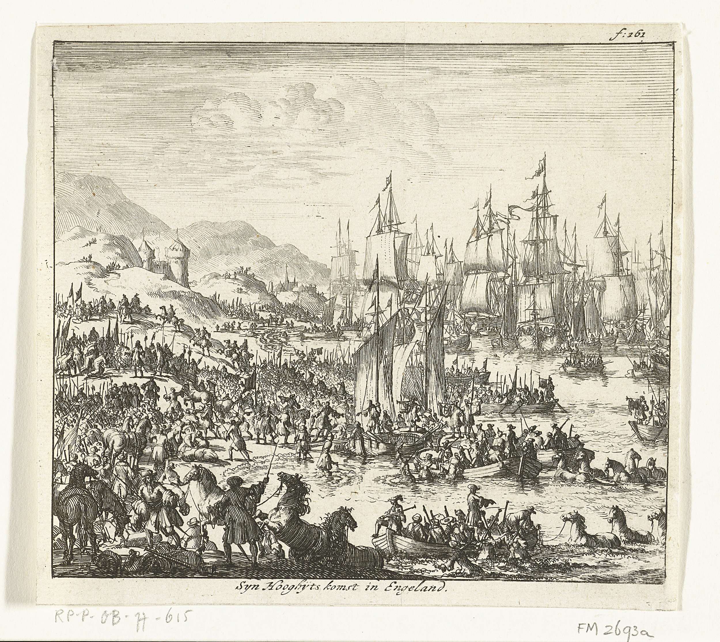 Aankomst van de vloot met prins Willem III bij Torbay in Engeland, 15 november 1688. Gemerkt rechtsboven: f: 161.