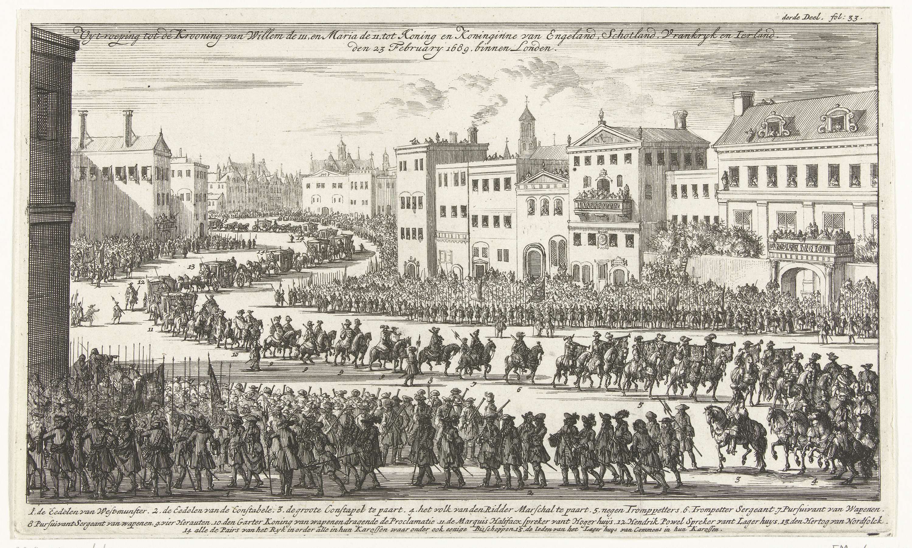 Een lange stoet met de leden van het Parlement door de straten van Londen om een uitroep te doen tot kroning van de prins en prinses van Oranje tot koning en koningin van Engeland, 23 februari 1689. In het onderschrift de legenda 1-15. Gemerkt rechtsboven: derde Deel. fol. 33.