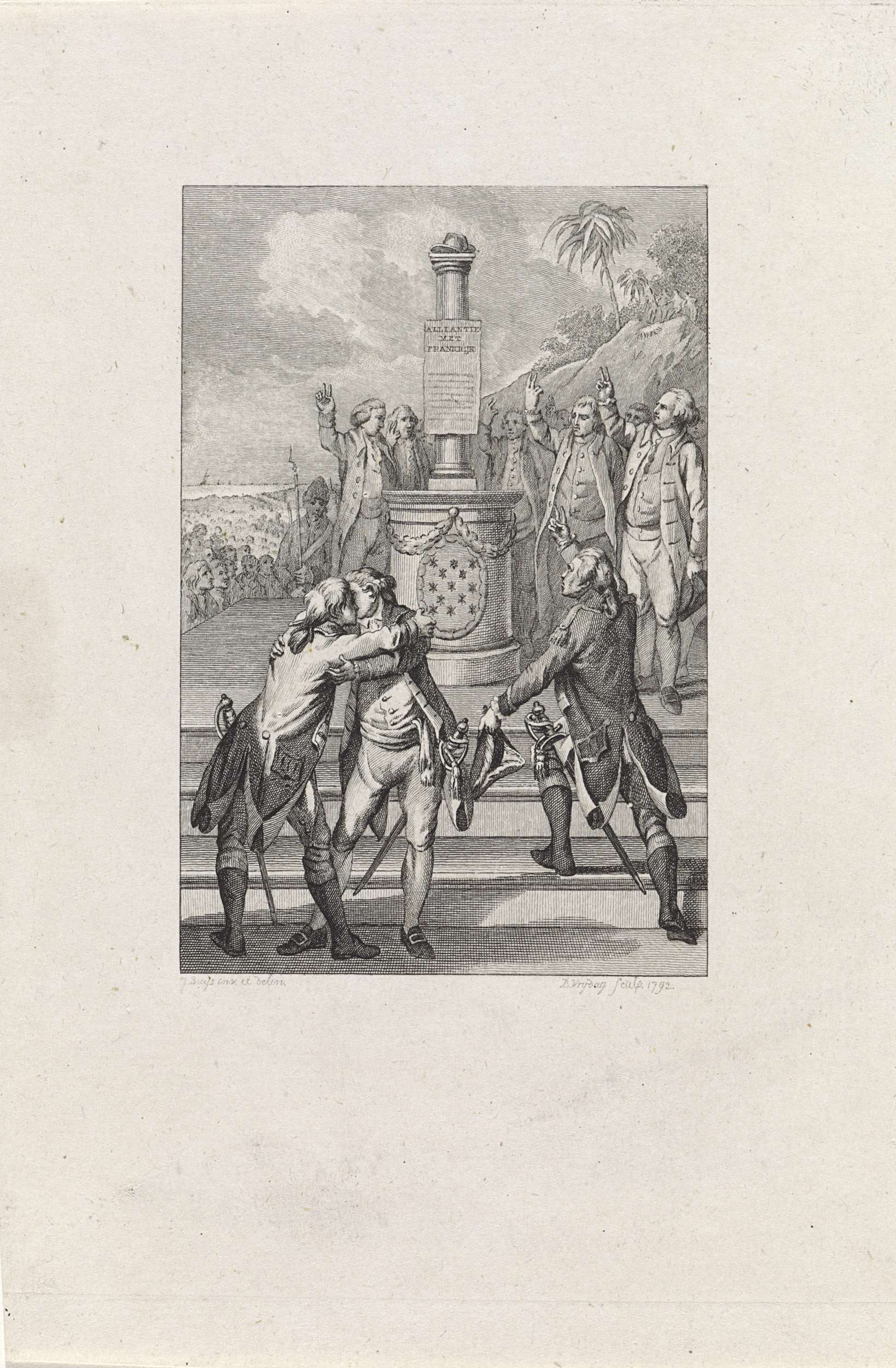 Koning Willem III gezeten op de troon woont een zitting van het Hogerhuis bij, 1689. In het midden en links en rechts zitten de Lords op kussens. Vooraan de griffiers rond een tafel. Bovenaan de maagd Britannica in de wolken met de portretten van Koning Willem III en koningin Maria II Stuart, links en rechts ...