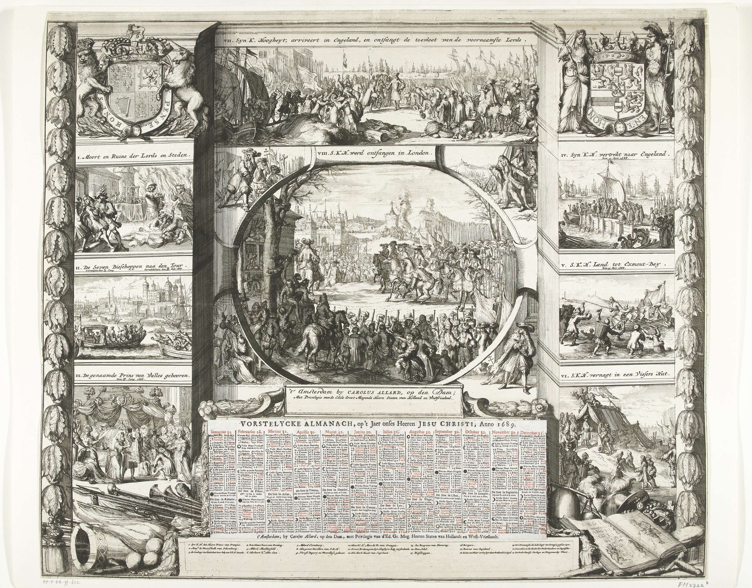 Allegorie ter ere van Willem III bij zijn komst naar Engeland met acht scènes genummerd I-VIII van de tocht zelf en voorafgaande gebeurtenissen, 1688. Links onder het wapen van Jacobus II drie scènes van de wandaden onder zijn bewind, waaronder de geboorte van het molenaarskind, in het midden de aankomst van Willem III in Engeland ...