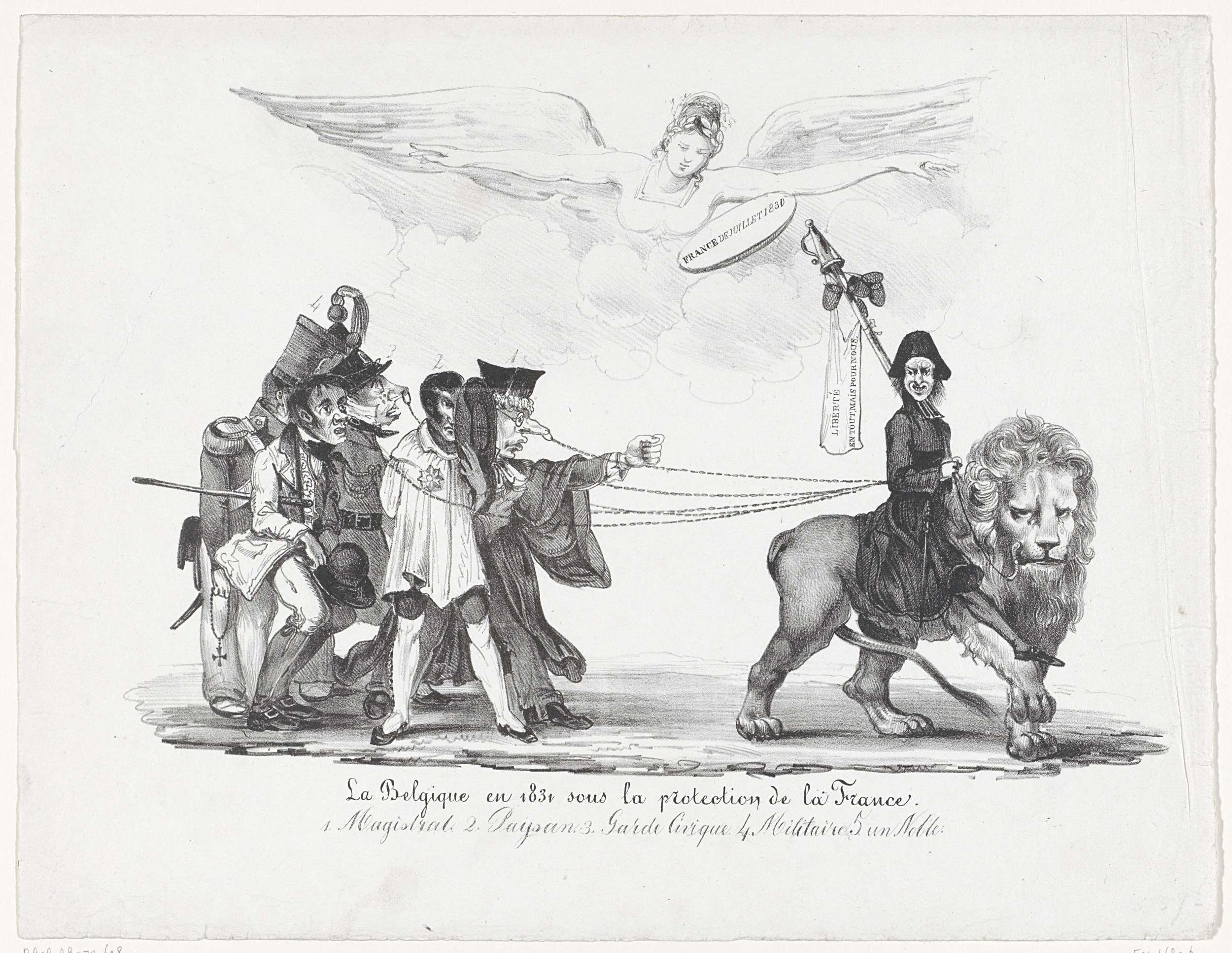 Spotprent op de politieke toestand van België onder Franse bescherming in 1831. Een jezuïet rijdend op de Belgische leeuw voert geketend aan de neus achter hem aan de vertegenwoordigers van de verschillende Belgische standen: magistratuur, boeren, schutterij, militairen en de adel. De jezuïet draagt een stok met een domper. In de lucht zweeft een engel ...