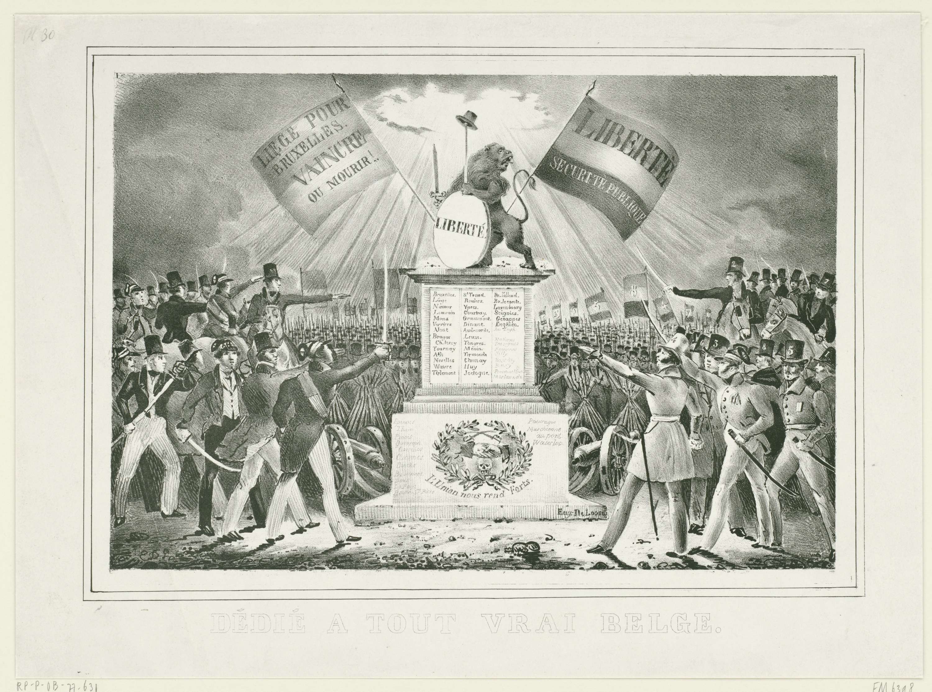 Allegorie op de eensgezindheid van de Belgen bij de opstand, 1830. Gewapende Belgische opstandelingen verzameld rond een monument voor de vrijheid. Op het monument de Belgische leeuw met twee vaandels, op het voetstuk de namen van de opstandige steden.