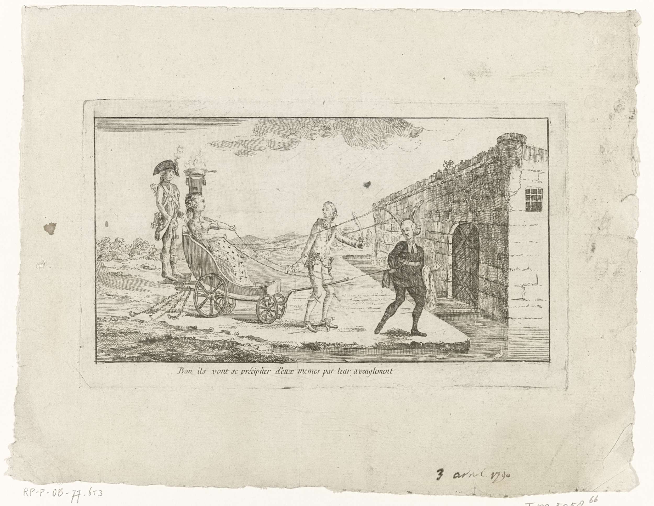 Spotprent op Hendrik van der Noot en Petrus van Eupen die zich voor de kar laten spannen van (de grote hoer) Madame Pinau, op de bok rijdt Van Hamme als palfrenier. Hierbij de datum 3 april 1790 met de hand geschreven. Onderdeel van een grote groep van prenten betrekking hebbend op de gebeurtenissen van de ...