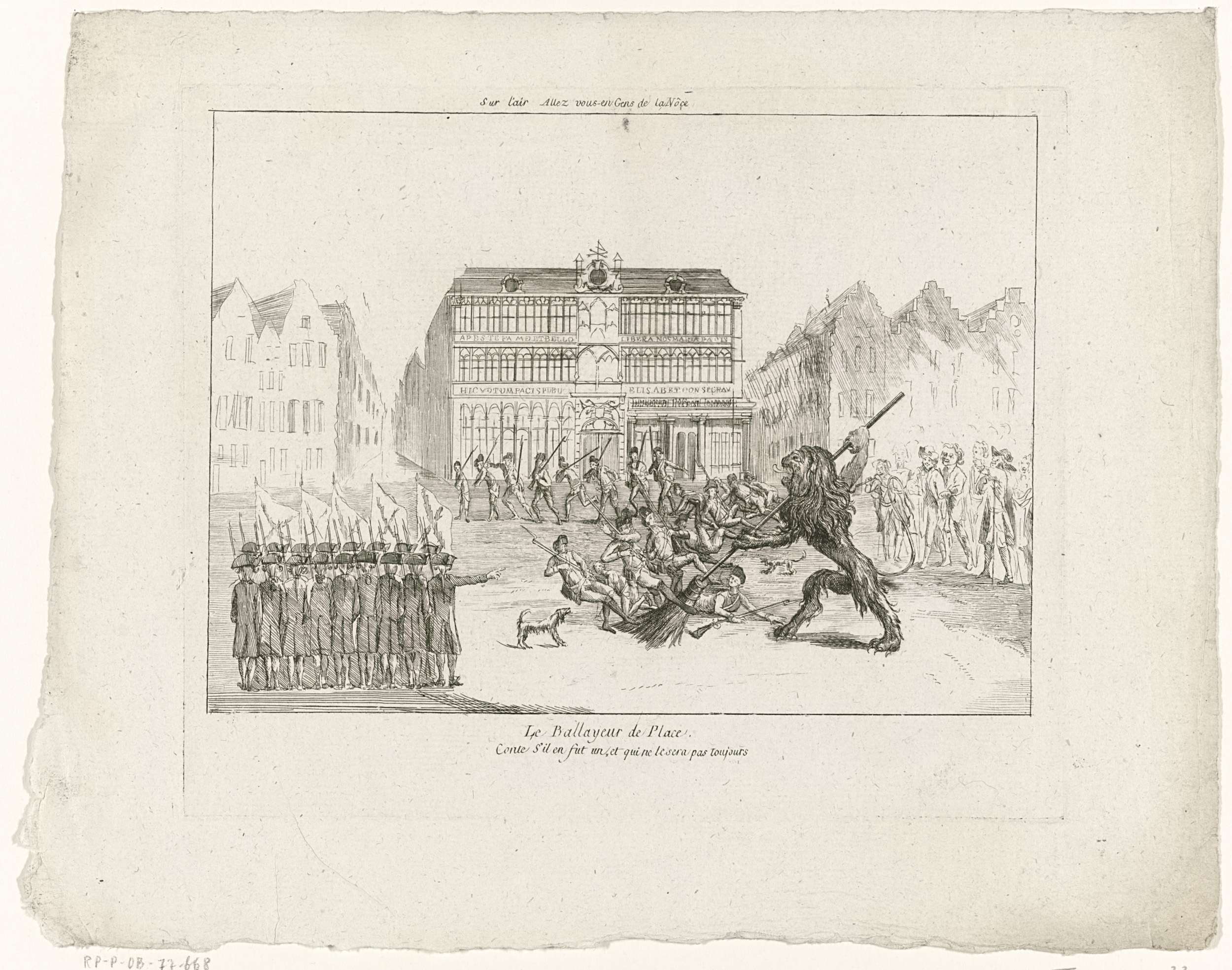 De Brabantse leeuw veegt een plein schoon van soldaten. Op de achtergrond het Maison du Roi (voorloper van het huidige Broodhuis) op de Grote Markt te Brussel. Gerelateerd aan 1 september 1788. Onderdeel van een grote groep van prenten betrekking hebbend op de gebeurtenissen van de Brabantse Omwenteling en de periode 1787-1790.
