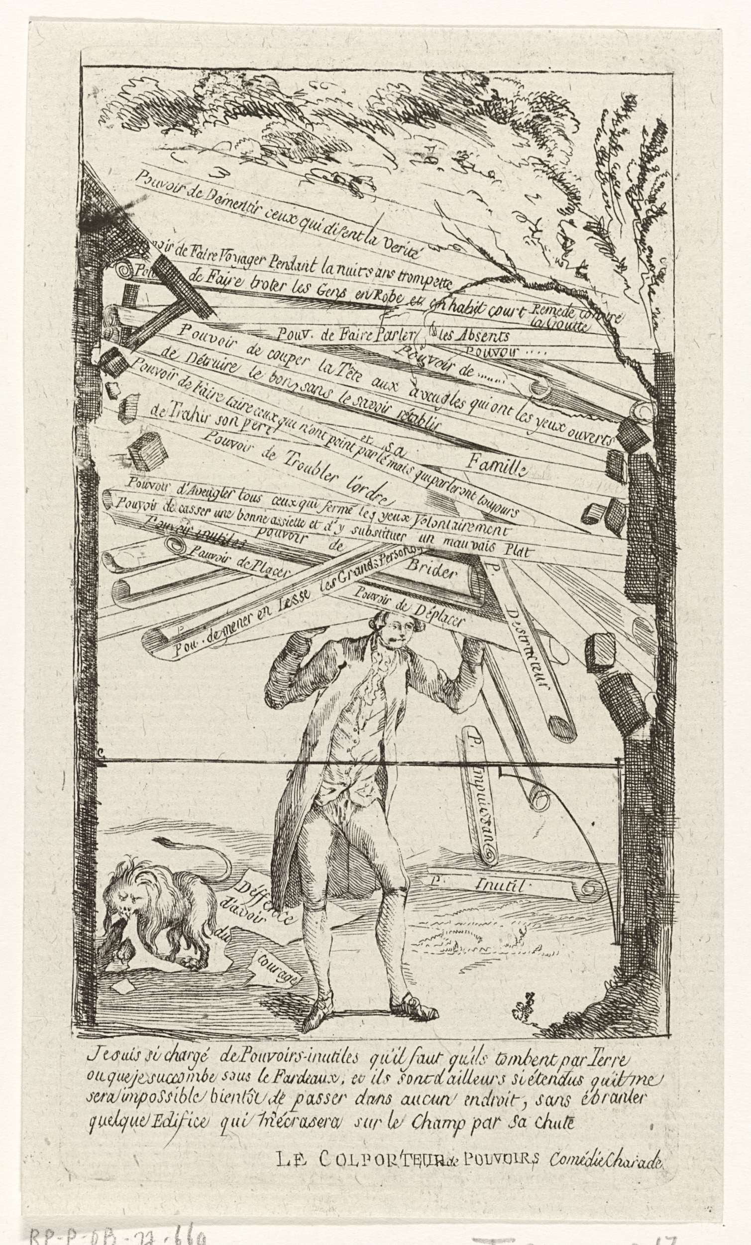 Spotprent op een man die een grote hoeveelheid documenten met taken (pouvoirs) op zijn schouders torst. Met vierreglig onderschrift in het Frans. In verband met gebeurtenissen in januari 1788. Onderdeel van een grote groep van prenten betrekking hebbend op de gebeurtenissen van de Brabantse Omwenteling en de periode 1787-1790.