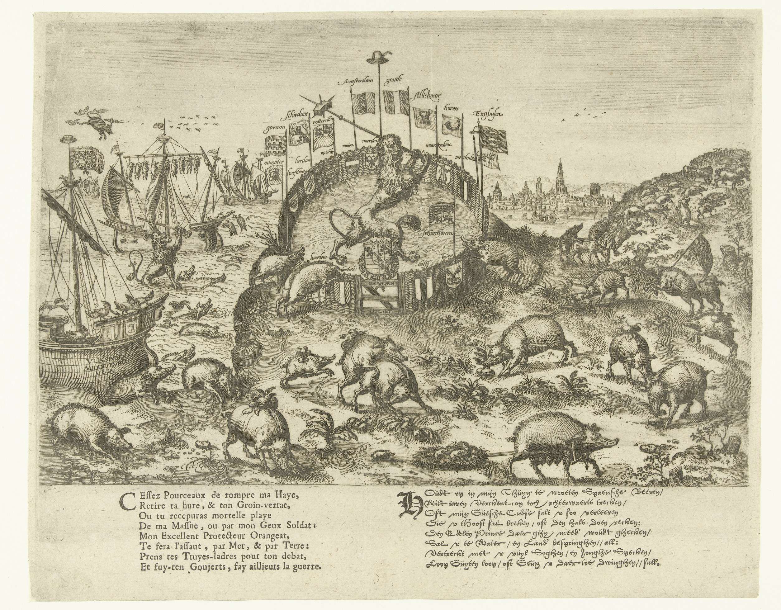 De Hollandse Leeuw in de Hollandse Tuin, ca. 1580. Op het hek staan de wapens van bevrijde Hollandse steden, op het toegangshek het wapen van de prins van Oranje. De tuin wordt belaagd en omgewoeld door Spaanse zwijnen, rechts een zwijn met het vaandel van Alva. Links de zee met een schip bemand door ganzen ...