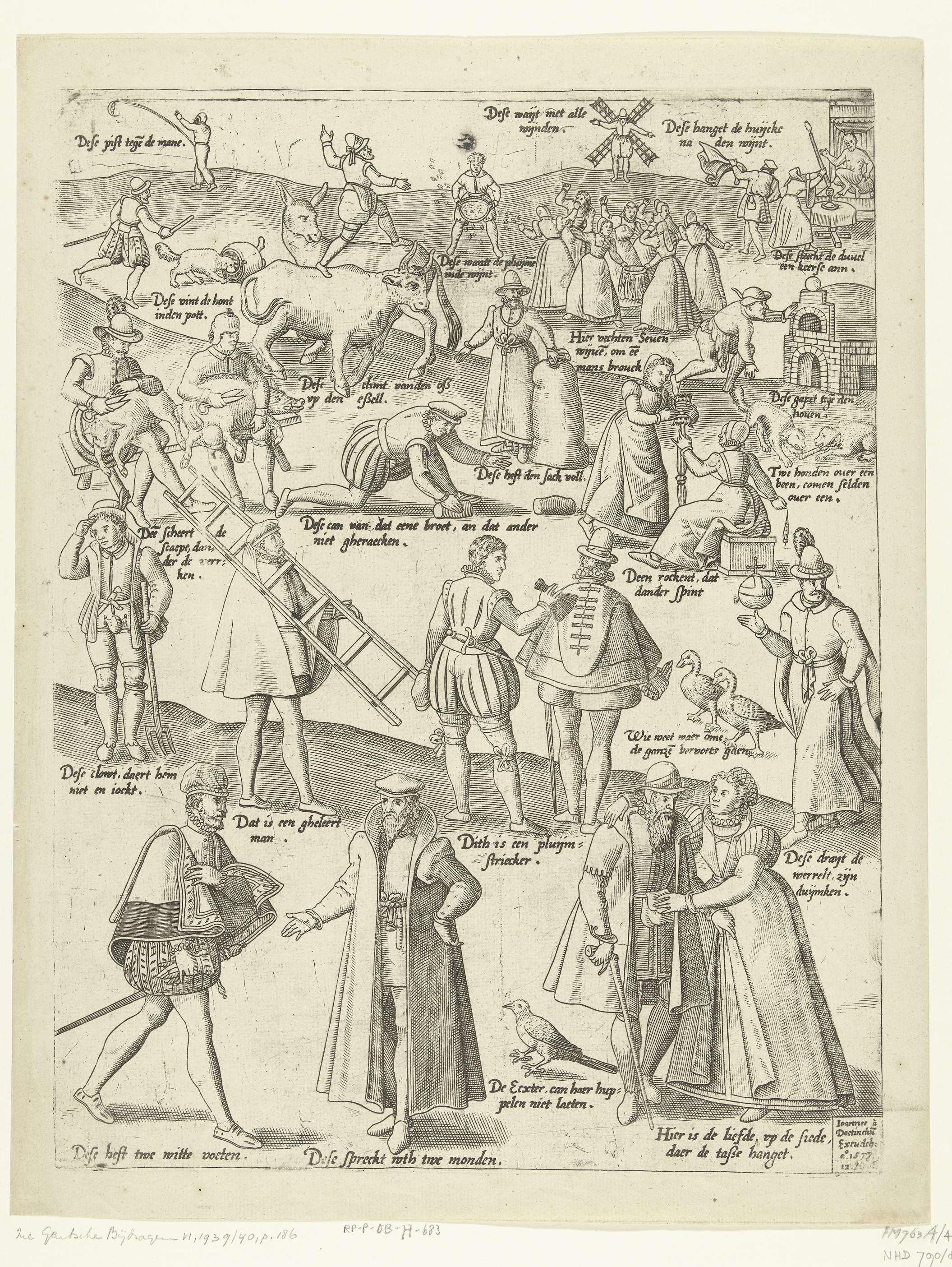 De Blauwe Huyck (blad 4). Verschillende spreekwoorden op een blad: m.o.: Dese spreckt wth twe monden / l.b.: Dese pist tege[n] de mane / r.b. : Dese hanget de huijcke na den wijnt / r.o.: Hier is de liefde, op de siede, daer de tasse hanget.