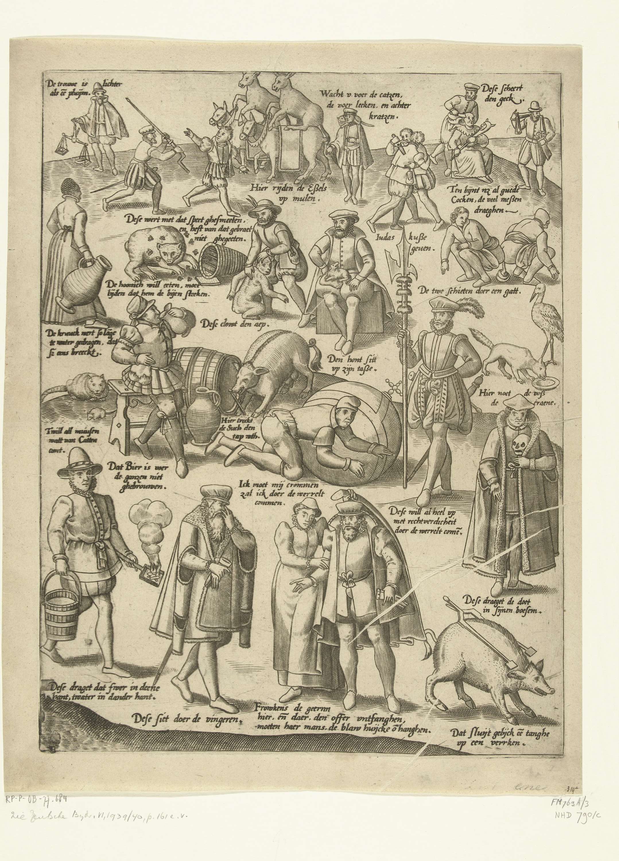De Blauwe Huyck (blad 3). Verschillende spreekwoorden op een blad: l.o.: dese siet doer de vingeren / r.o.: dat sluijt gelijck ee[n] tanghe op een verrken / r.b.: dese scheert den geck / m.b.: wacht u voer de catzen, die voer lecken, en achter kratzen.
