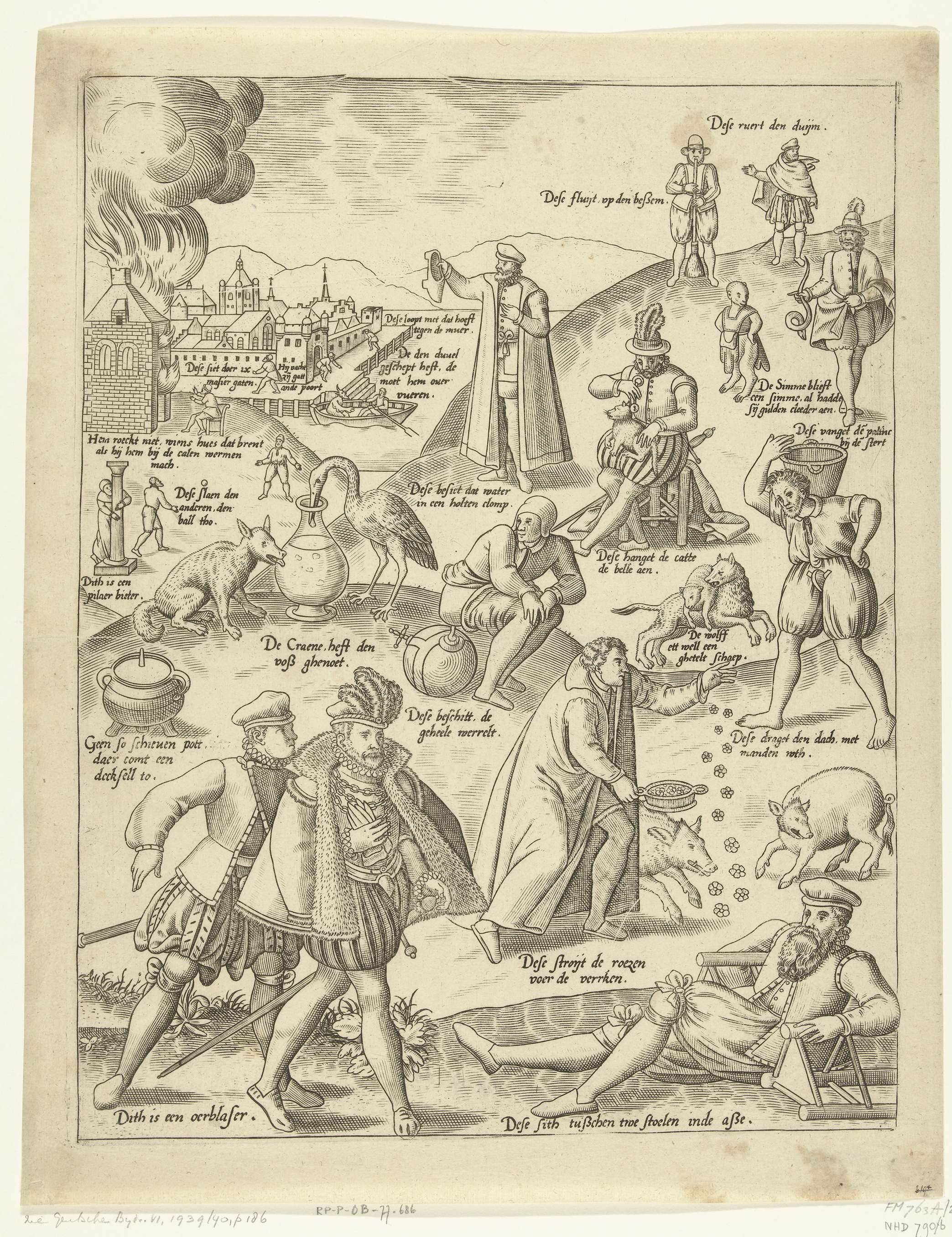 De Blauwe Huyck (blad 2). Verschillende spreekwoorden op een blad: r.o. Dese sith tusschen twe stoelen inde asse / l.o.: Dith is een oerblaser (oorblazer) / r.b.: Dese ruert den duijm / midden: Dese beschitt de geheele werrelt.