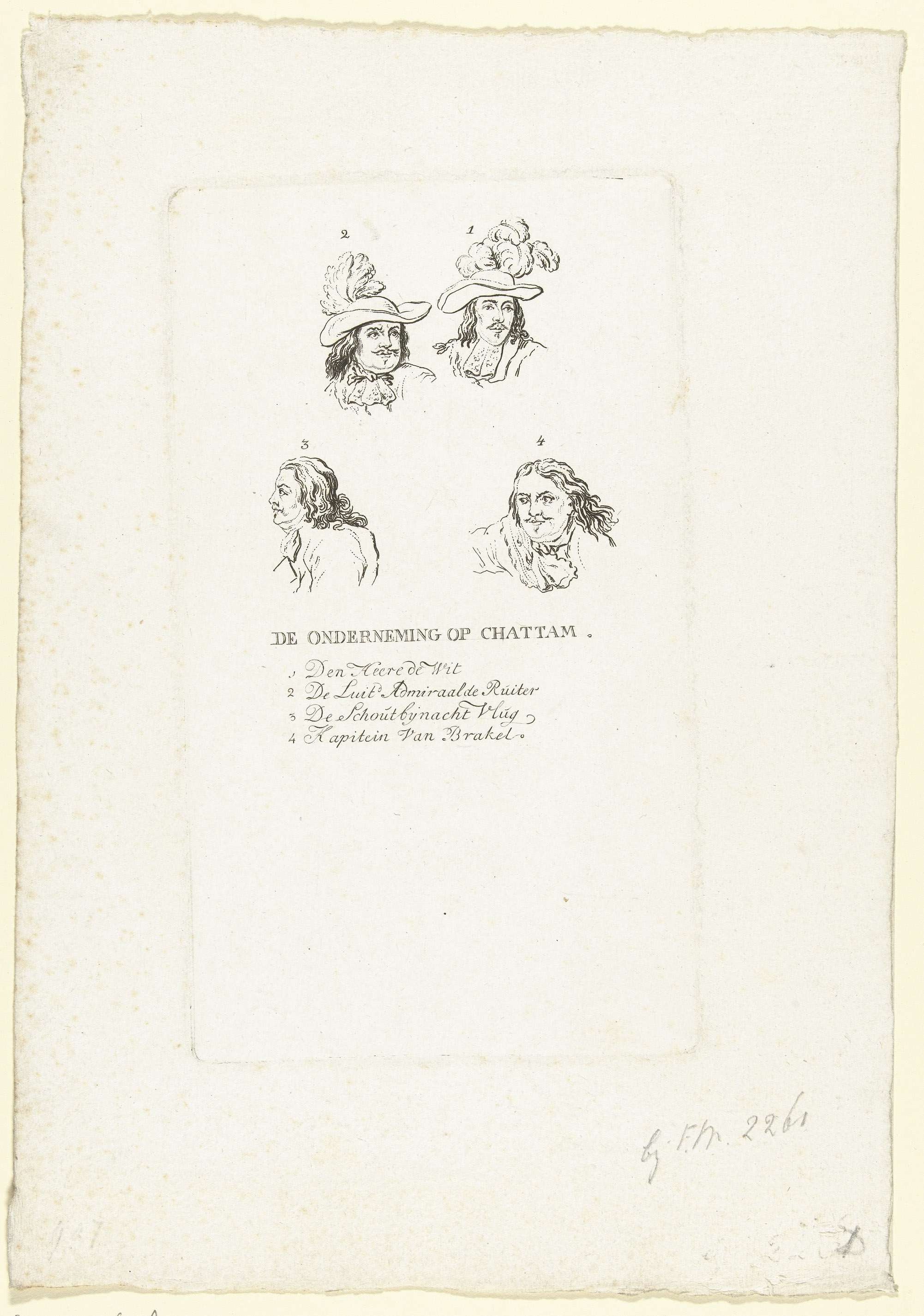 De hoofden van de vier hoofdpersonen op de voorstelling van de gevechten te Chatham en de verovering van het Engelse vlaggeschip de Royal Charles op 22 juni 1667. De hoofden genummerd 1: Cornelis de Witt, 2: Michiel Adriaenszoon de Ruyter, 3: schout-bij-nacht David Vlugh, 4: kapitein Jan van Brakel. Deze sleutel behoort bij de grote ...