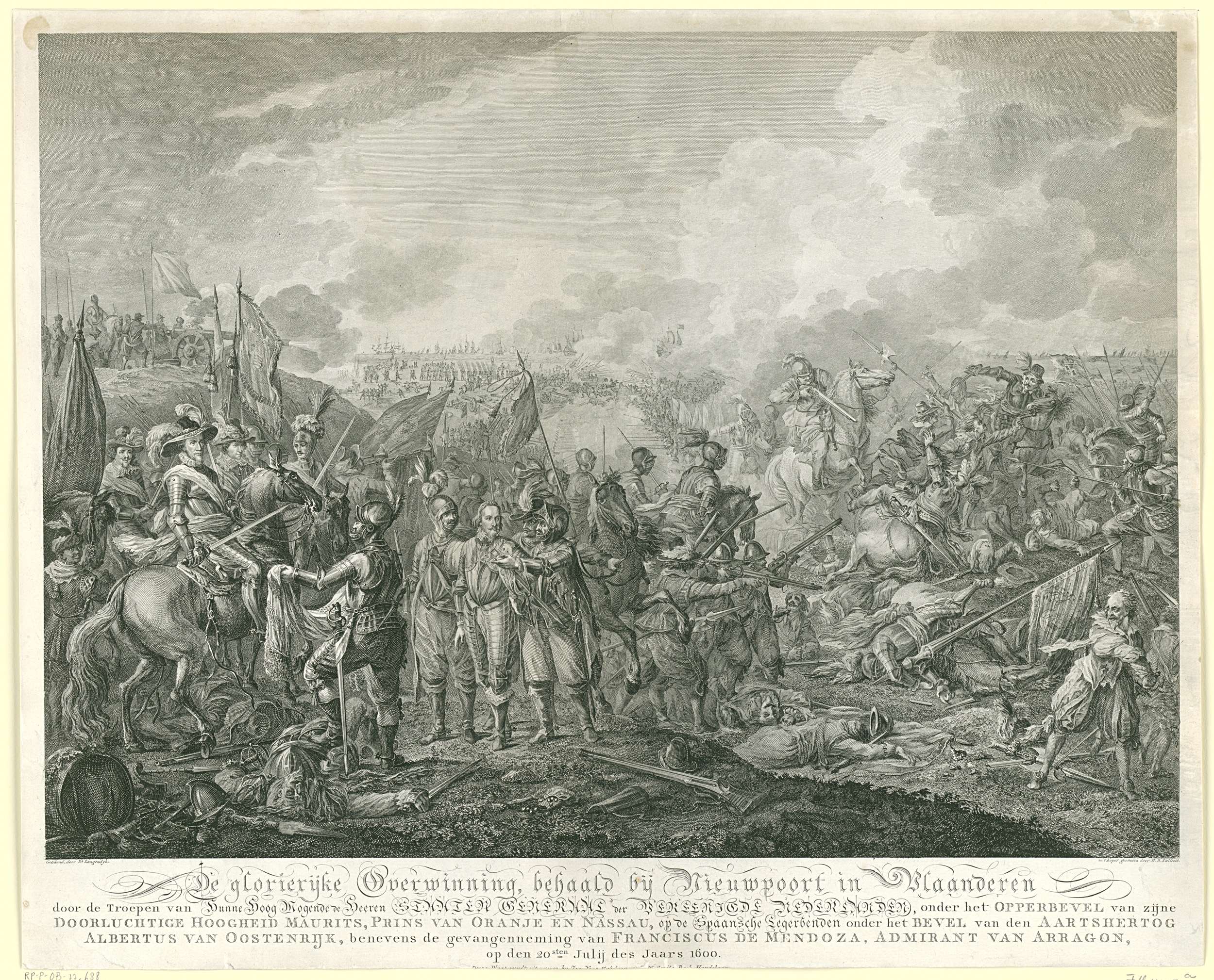 De slag bij Nieuwpoort, 2 juli 1600. Op de voorgrond links prins Maurits te paard, omgeven door soldaten en officieren, de gevangengenomen Franciscus van Mendoza wordt naar de prins geleid. Op de achtergrond woedt de veldslag.