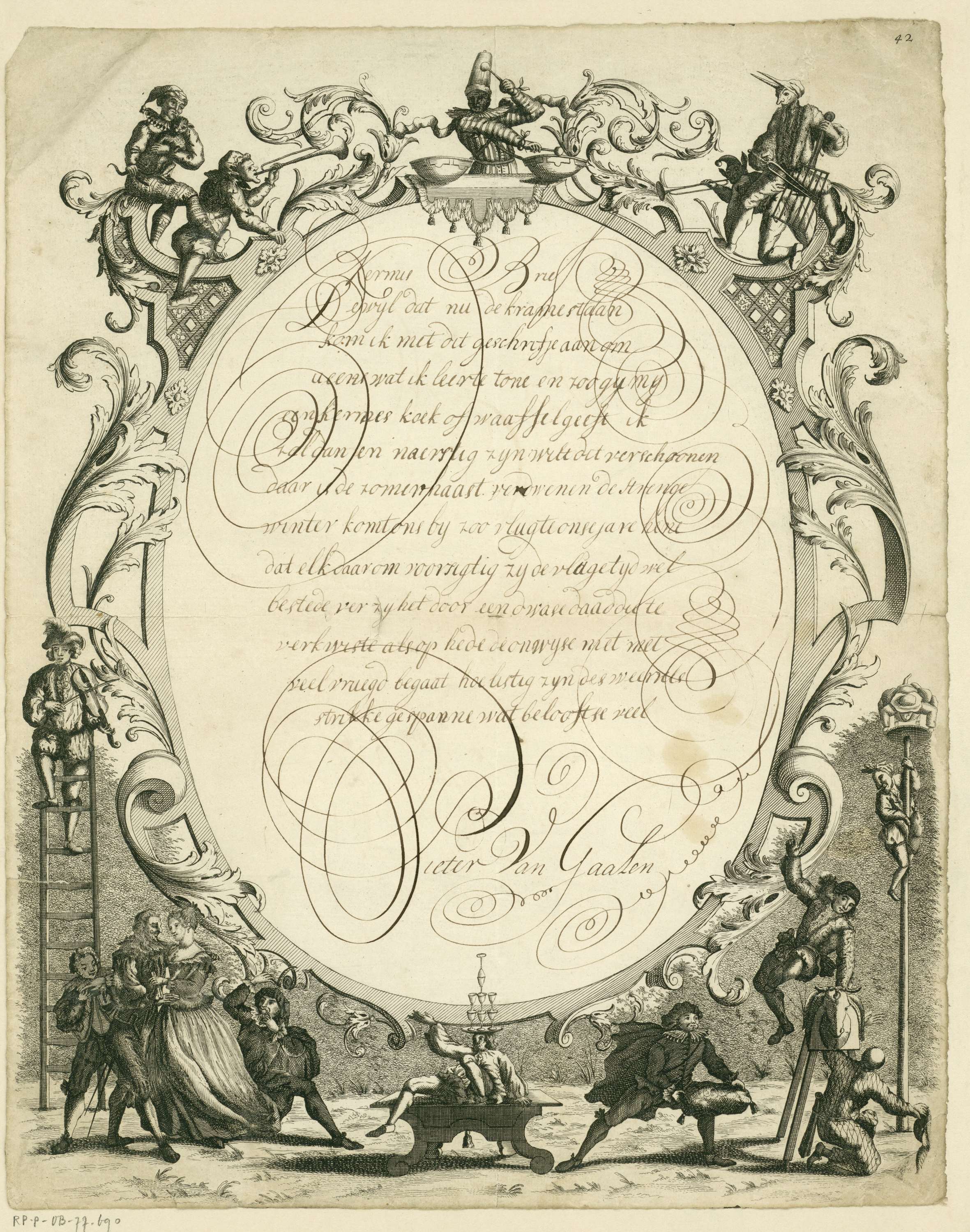 Wensbrief met beschreven cartouche binnen een decoratief kader met voorstellingen van circusartiesten en een dansend paar. Handgeschreven bericht in kalligrafie (kermisbrief) door Pieter van Gaalen. Genummerd rechtsboven: 42.