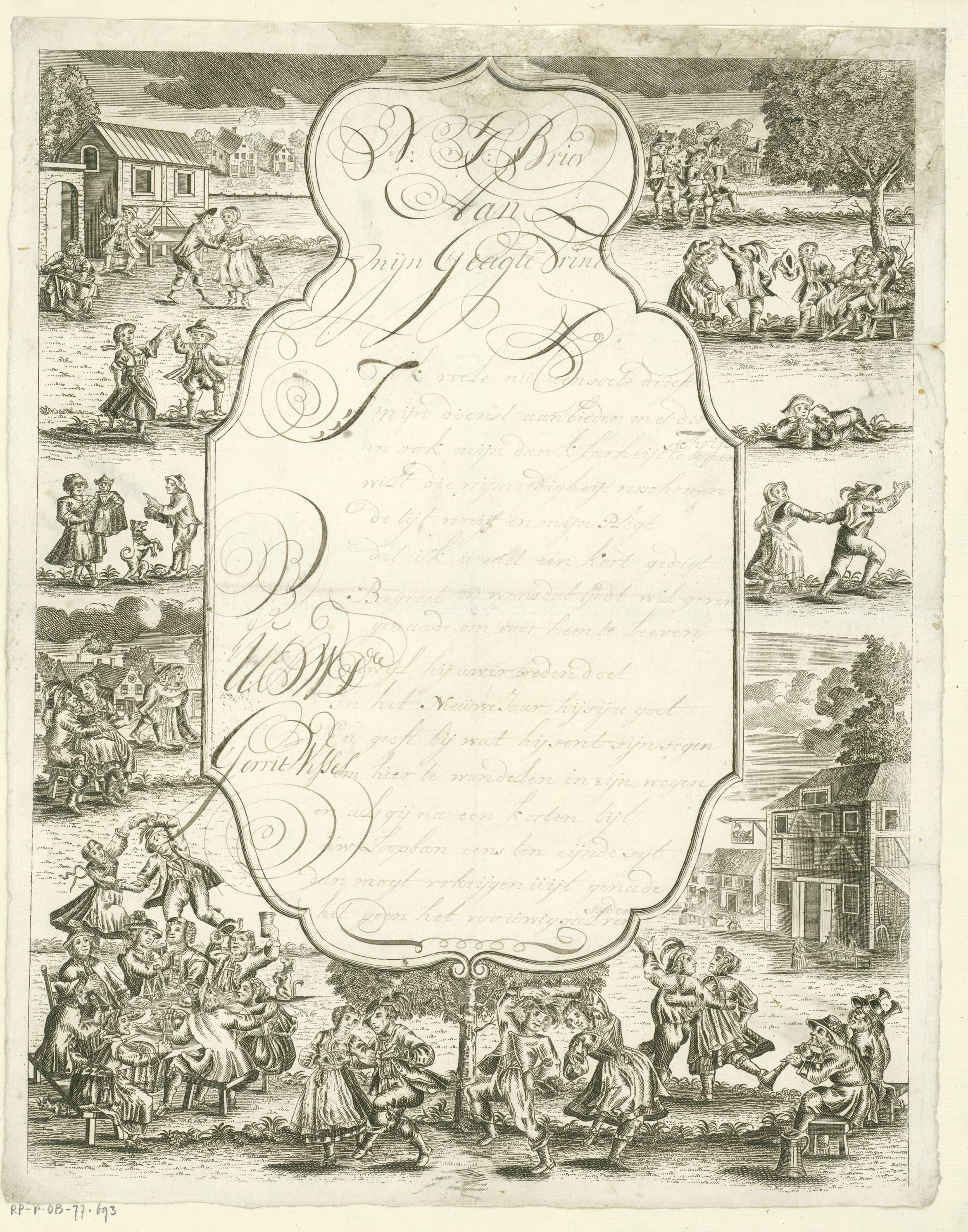 Wensbrief met beschreven cartouche binnen een decoratief kader met herbergtaferelen: drinkende en etende mensen aan tafel, dansende mensen en rechtsboven een paar muzikanten. Handgeschreven bericht in kalligrafie (Nieuwjaarsbrief) door Gerrit Visser aan zijn vriend.