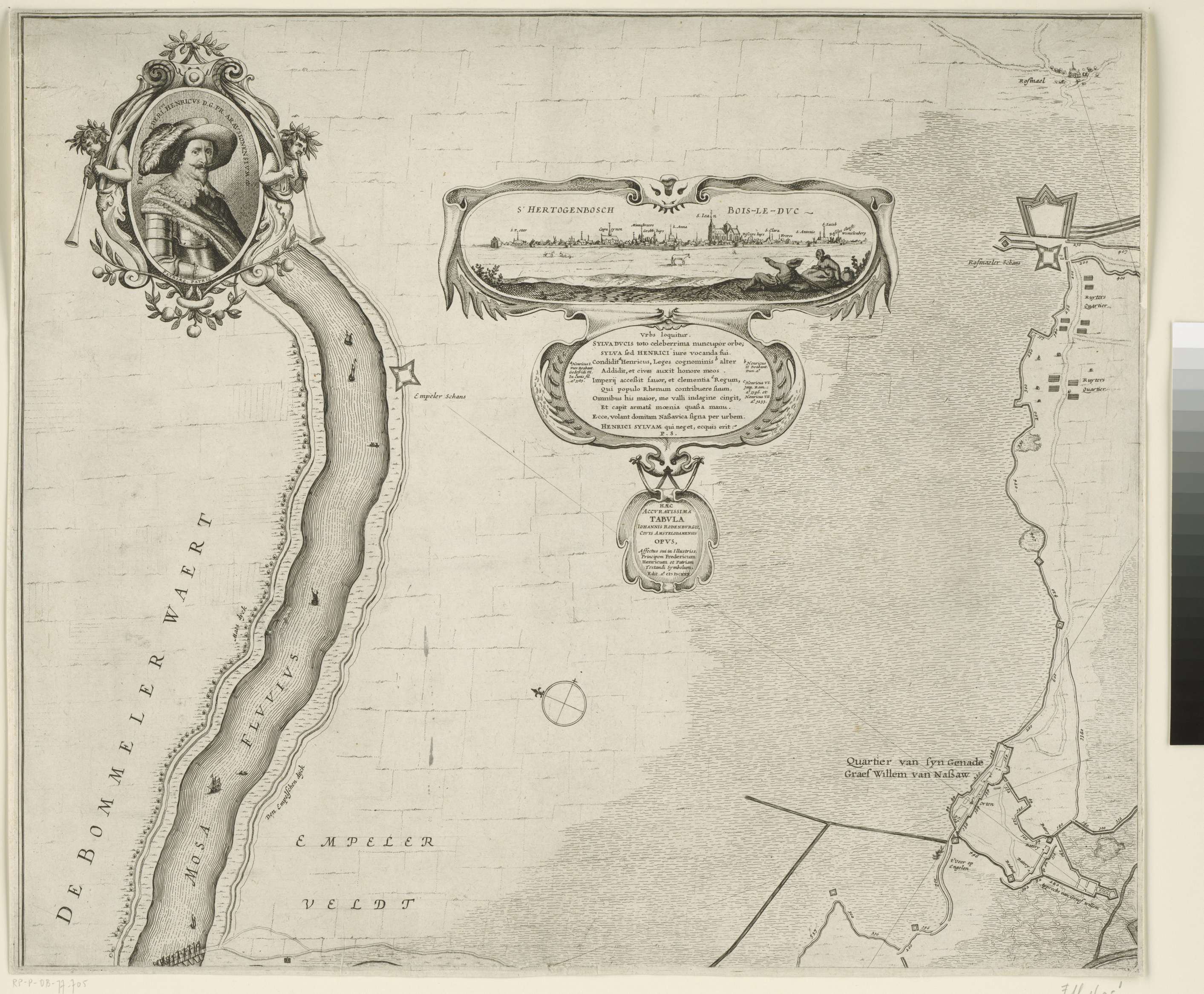 Grote kaart van de omsingeling van Den Bosch tijdens het beleg door het Staatse leger onder Frederik Hendrik, van 1 mei tot 17 september 1629. Geheel bestaande uit 4 platen en 4 tekstbladen. Dit is het blad linksboven met een deel van de kaart, het portret van Frederik Hendrik in medaillon, cartouches met een gezicht ...