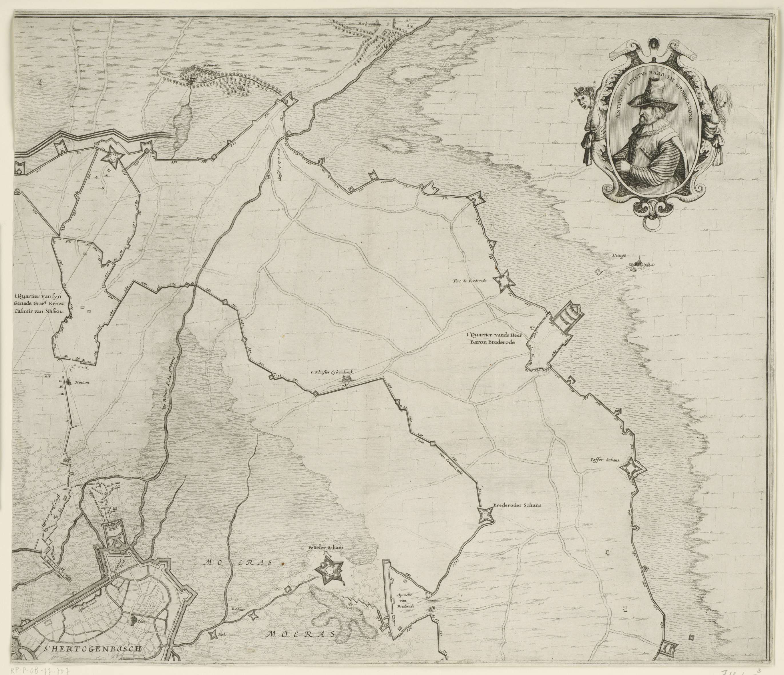 Grote kaart van de omsingeling van Den Bosch tijdens het beleg door het Staatse leger onder Frederik Hendrik, van 1 mei tot 17 september 1629. Geheel bestaande uit 4 platen en 4 tekstbladen. Dit is het blad rechtsboven met een deel van de kaart, in medaillon een portret van Anthonie Schets, Baron van Grobbendonck.