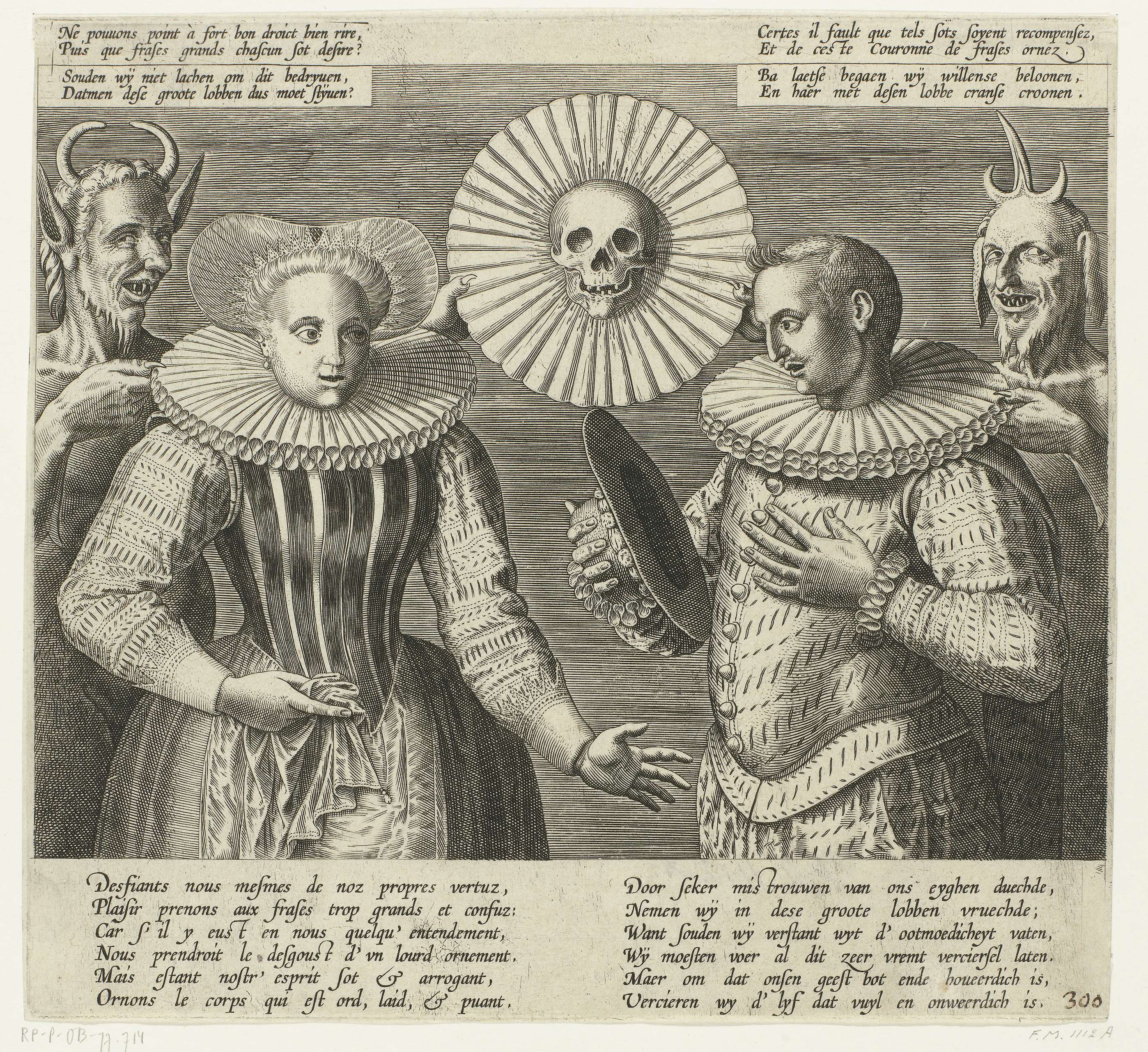 Spotprent op de plooikraag, ca. 1600. Een man en een vrouw, tegenover elkaar staand, beiden met brede geplooide kraag om de hals. Achter elk van hen een duivel die lachend op hen wijst. De duivels houden een grote plooikraag op waarin in het midden een doodshoofd. Met tekst waarin de dragers van de 'grote lobben' ...
