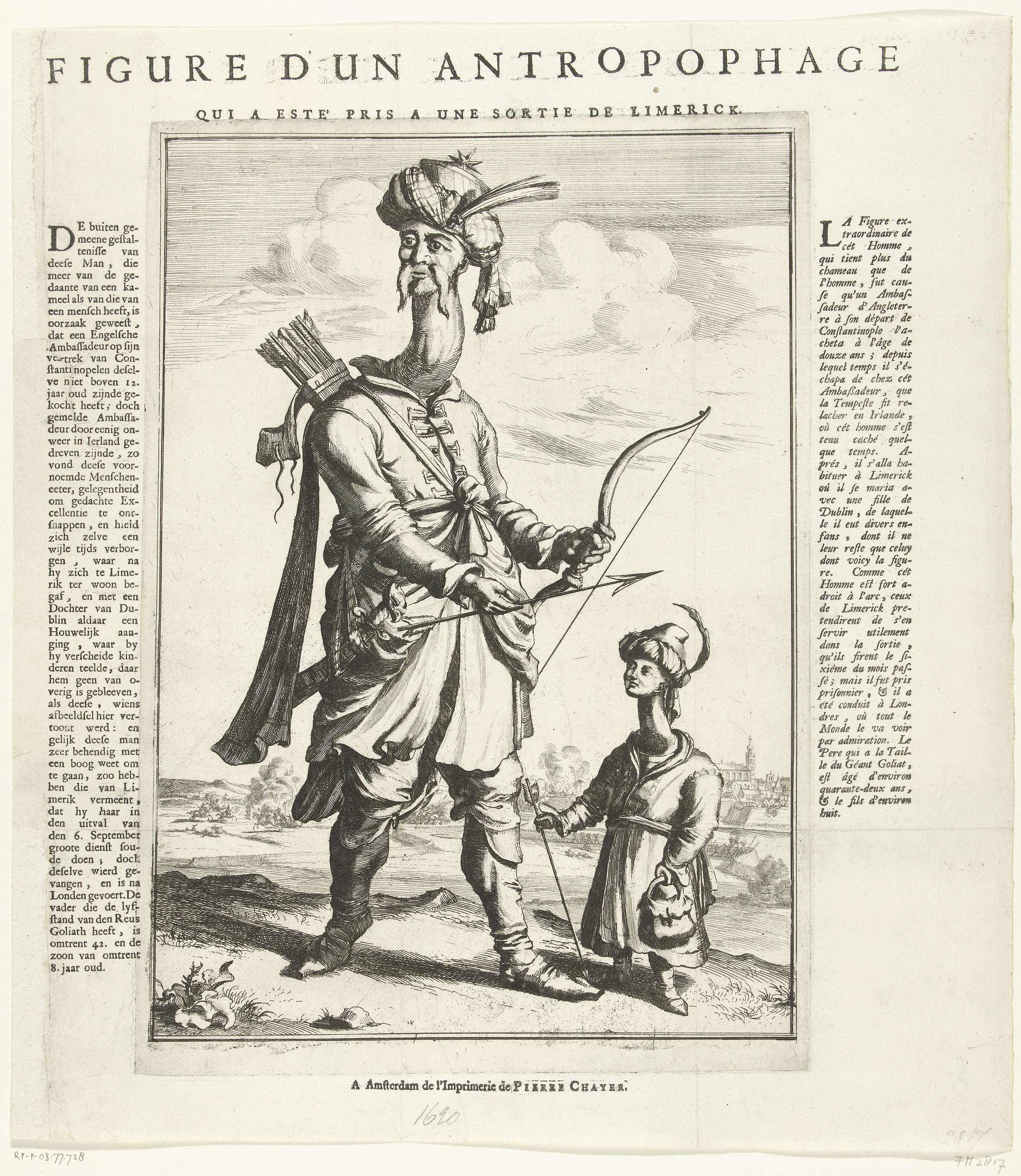 Een reus met zijn zoon, beiden met extreem lange nekken, bewapend met pijl en boog. Gevangengenomen door de troepen van koning Willem III tijdens de belegering van Limerick op 6 september 1690 en naar Londen overgebracht. Volgens de beschrijving een menseneter, half mens en half kameel en overgebracht vanuit Constantinopel. Met teksten in het Nederlands ...