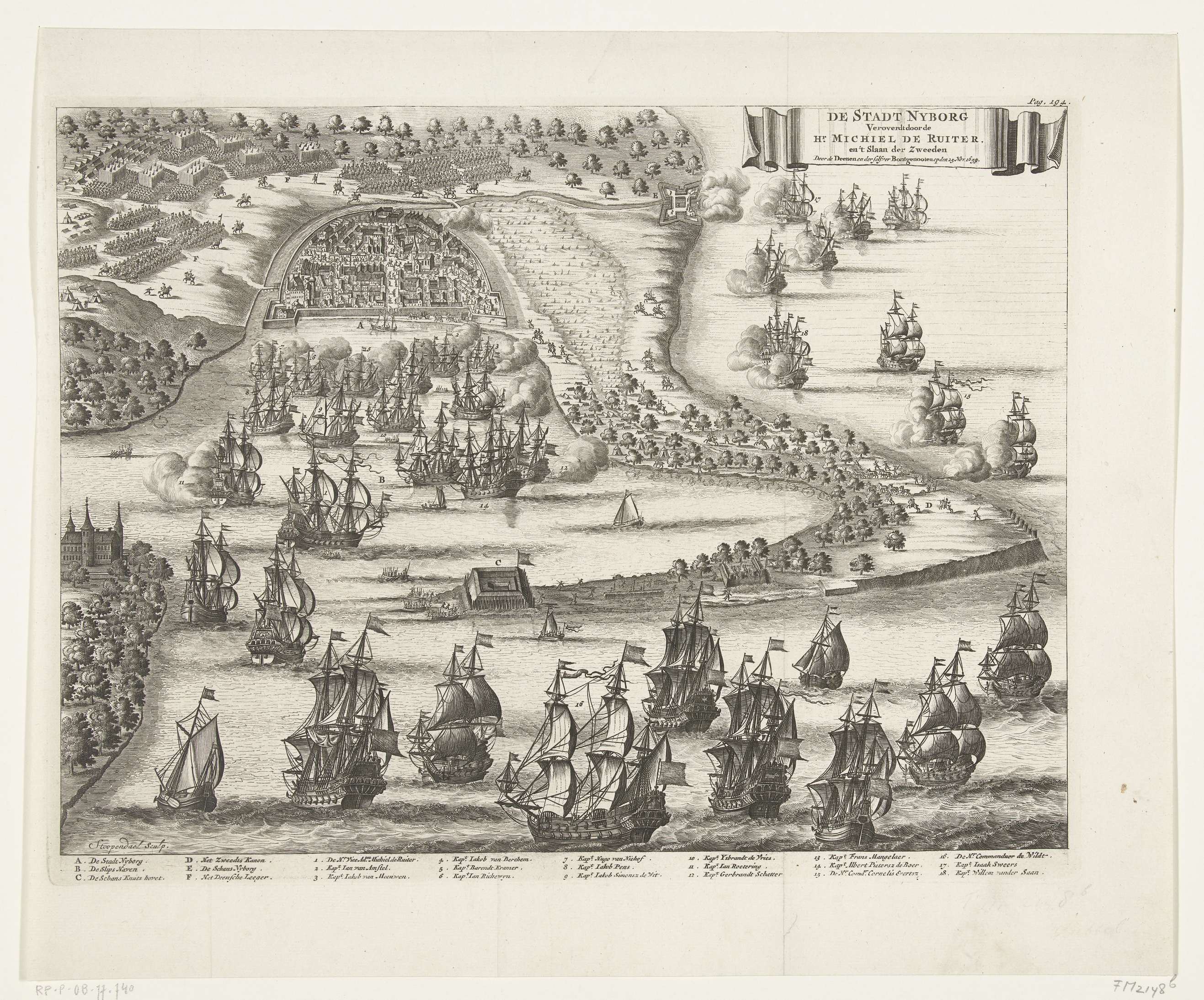 Inname van de stad Nyborg door Michiel Adriaenszoon de Ruyter en het verslaan van het Zweedse leger door de Denen, 25 november 1659. Kaart van het deel van het eiland Funen en plan van de stad met haven. Hollandse vloot op de voorgrond. Rechtsboven de titel in cartouche en gemerkt: Pag. 194. In het onderschrift ...