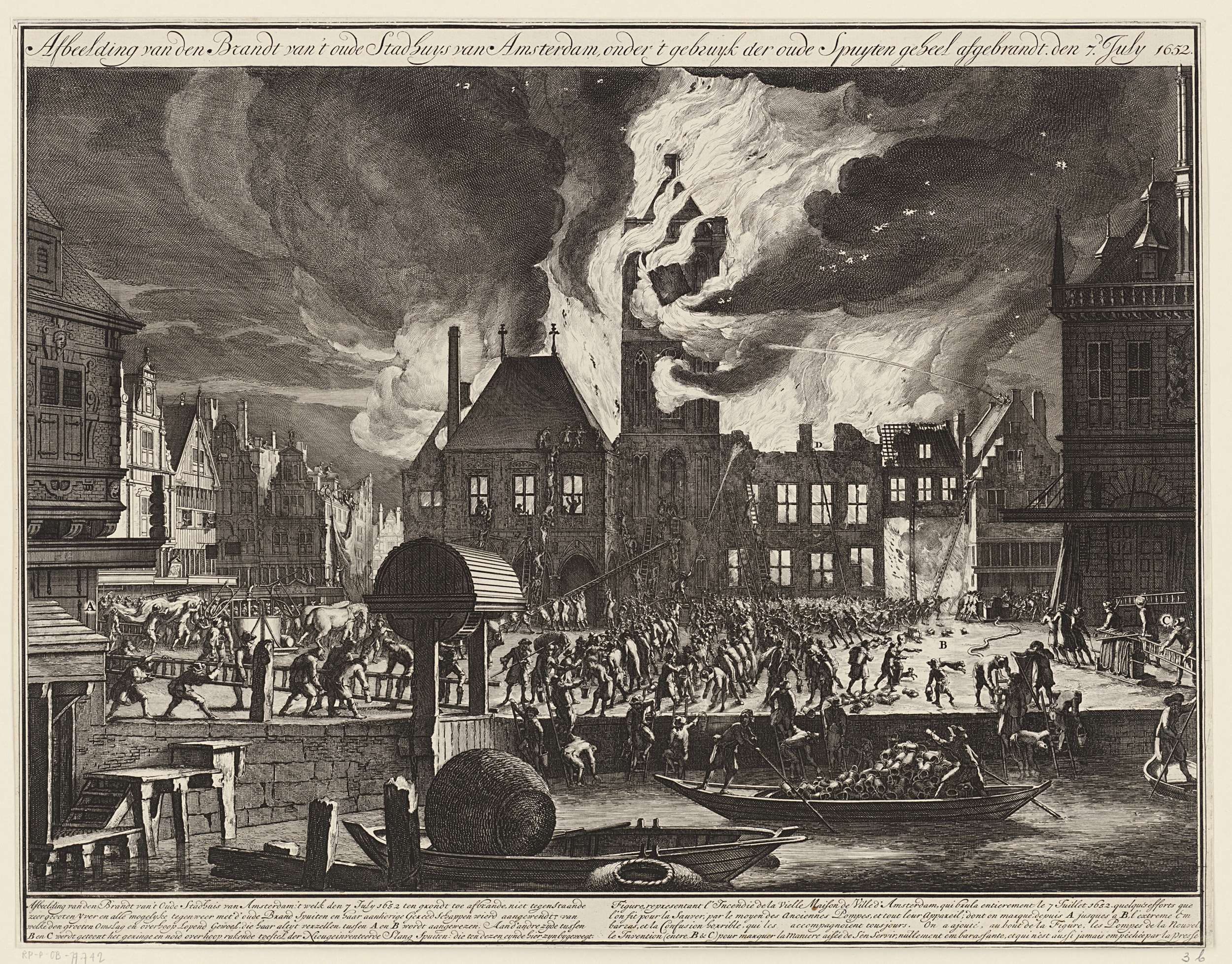De brand in het Oude Stadhuis van Amsterdam en enkele naast gelegen panden op 7 juli 1652. Ter illustratie van de oude en nieuwe manier van brand blussen. Links wordt met emmers en ladders gepoogd de brand te blussen, rechts wordt met brandspuiten de brand bestreden. Met vierregelig onderschrift in het Nederlands en Frans. Linksboven ...