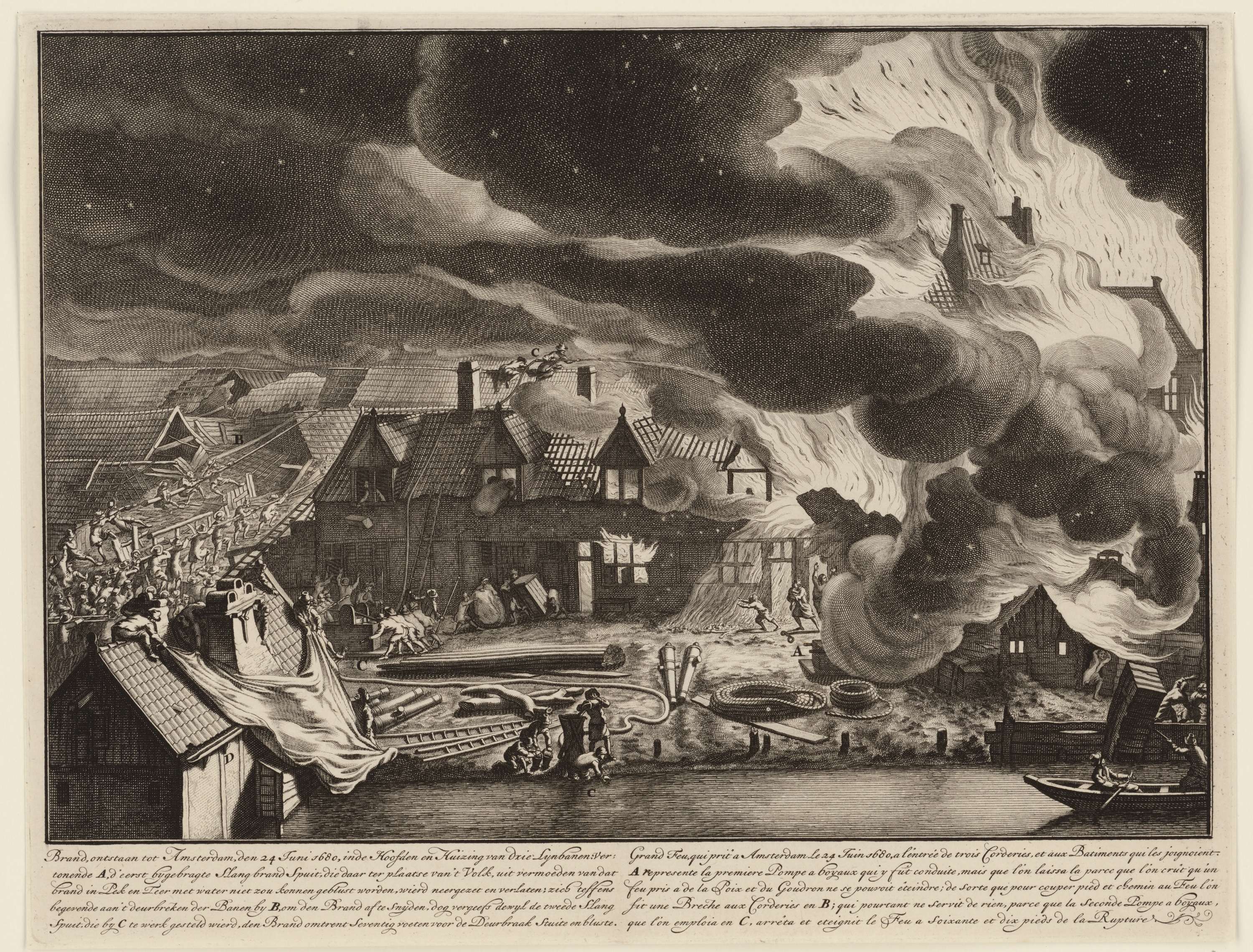 Brand in drie lijnbanen op de schans aan de Smallepadsgracht te Amsterdam, op 24 juni 1680. Met vijfregelig onderschrift in het Nederlands en Frans. Plaat 9 in het Brandspuitenboek van Jan van der Heyden.