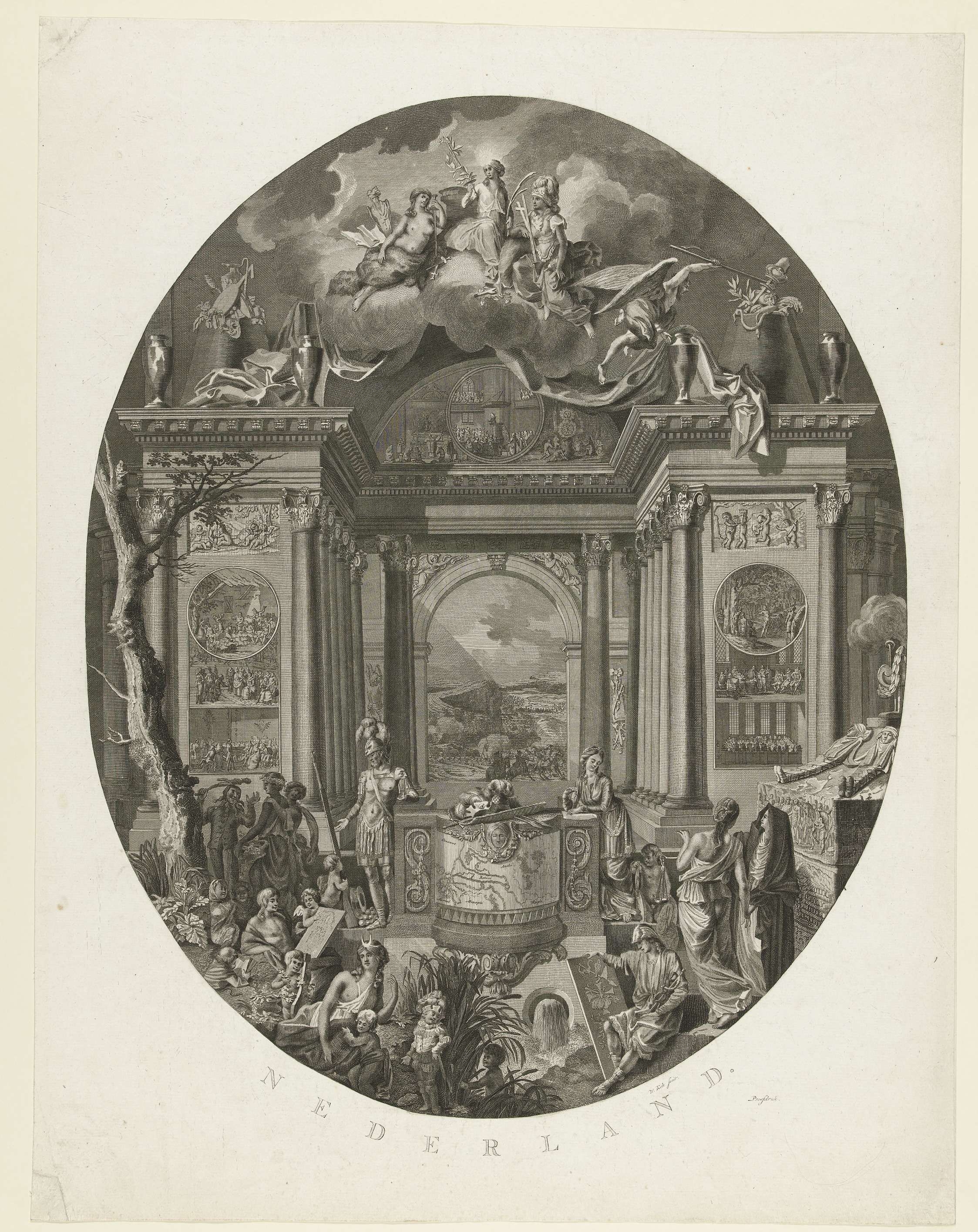 Ovale voorstelling van een tempel waarin de vroegste geschiedenis van Nederland uitgebreid verheerlijkt wordt.
