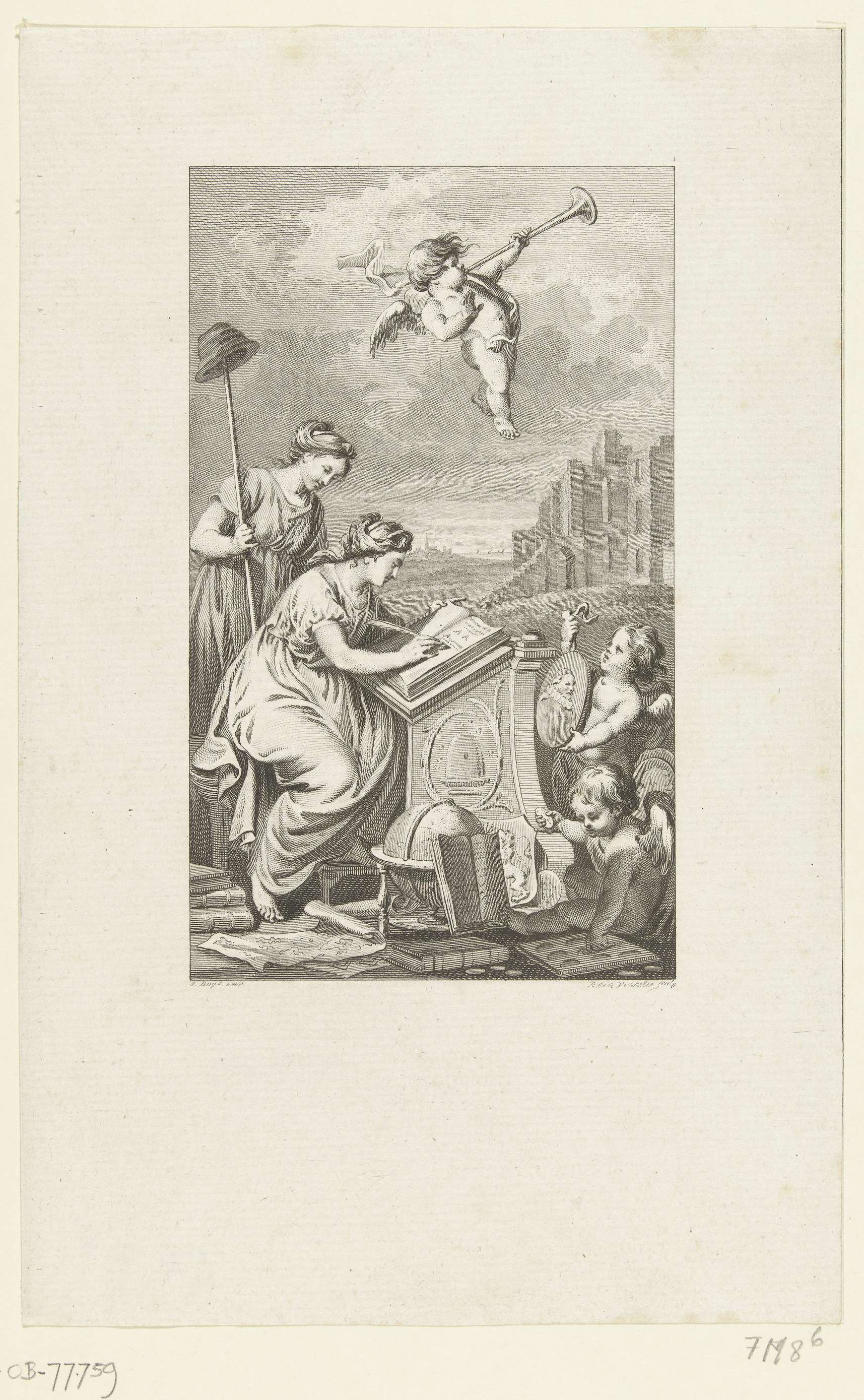 Allegorische voorstelling waarin de personificatie van Geschiedenis zittend een woordenboek schrijft, achter haar de Vrijheid, in de lucht de Faam. Gebruikt als titelprent voor Vaderlandsch Woordenboek van Jacobus Kok.
